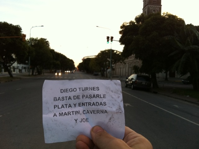 Anoche hubo un bloqueo en el monumental. Aparecieron volantes (foto de arriba) y también pintadas. Si bien las crónicas periodísticas (la mía incluida) hablan de «Interna en la hinchada» lo que estamos viendo en realidad es un cuestionamiento al manejo de la guita negra.