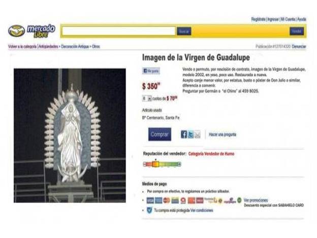 Se trata de un famoso portal de compra y venta on line. Allí, por un valor de 350 pesos se oferta la estatuilla, que según sus características se trataría de la virgen de Guadalupe que desapareciera de una de las cabeceras del estadio Brigadier López. Por la descripción del artículo, parece tratarse de una broma rojiblanca.