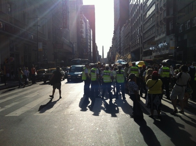 Flanqueados por la Policía Metropolitana los manteros reducen a la mitad el tránsito de vehículos por la avenida Corrientes altura Florida