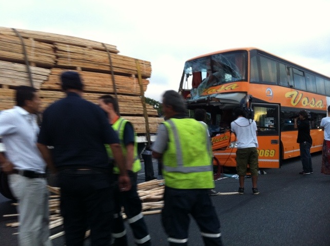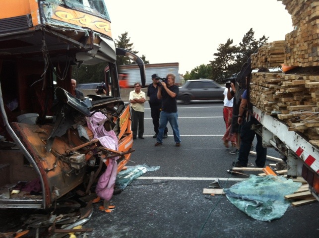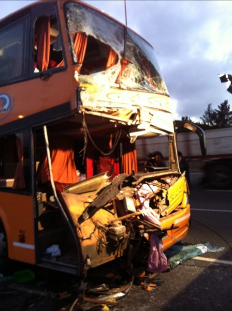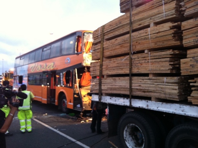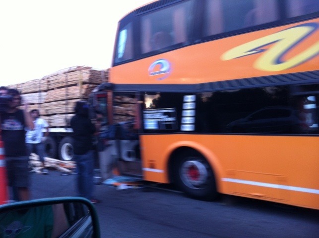 un micro con jubilados que iba a Mar del Plata se incrustó en el acoplado de un camión que trasladaba maderas