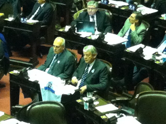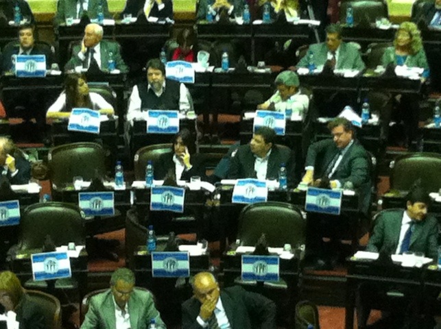 Los peronistas no tienen carteles: Kunkel tiene una remera de YPF sobre la banca y el resto pines