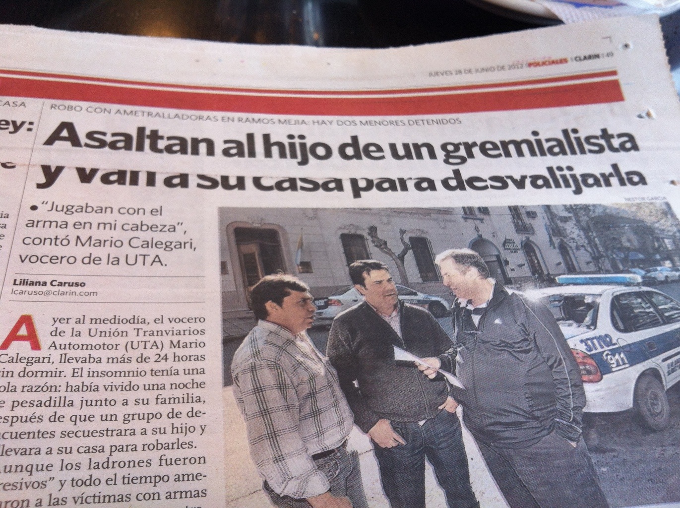 Hace dos días un nuevo caso de «inseguridad gremial» se vivió. Esta vez le toco a Mario Calegari: vocero de la UTA. Calegari -cuyo hijo fue secuestrado en la calle y obligado a conducir a los delincuentes a la casa del gremialista- refirió que los malvivientes jugaban con el arma en su cabeza.