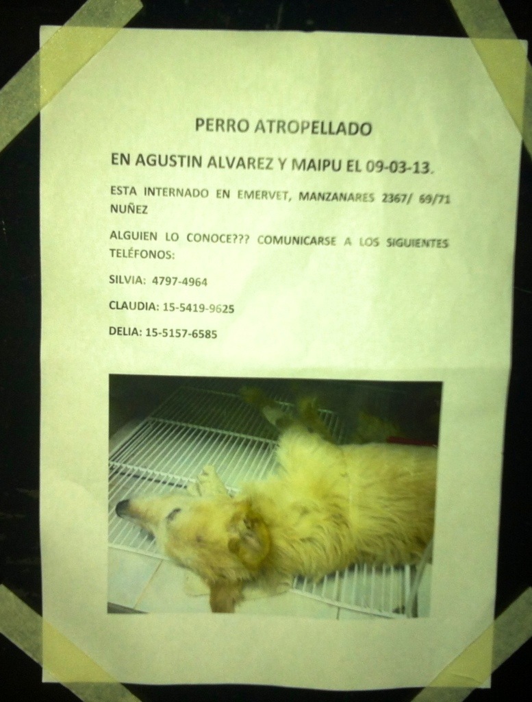 Este perro fue atropellado el 9 de Marzo en Agustín Alvarez y Maipú, Vicente Lopez.