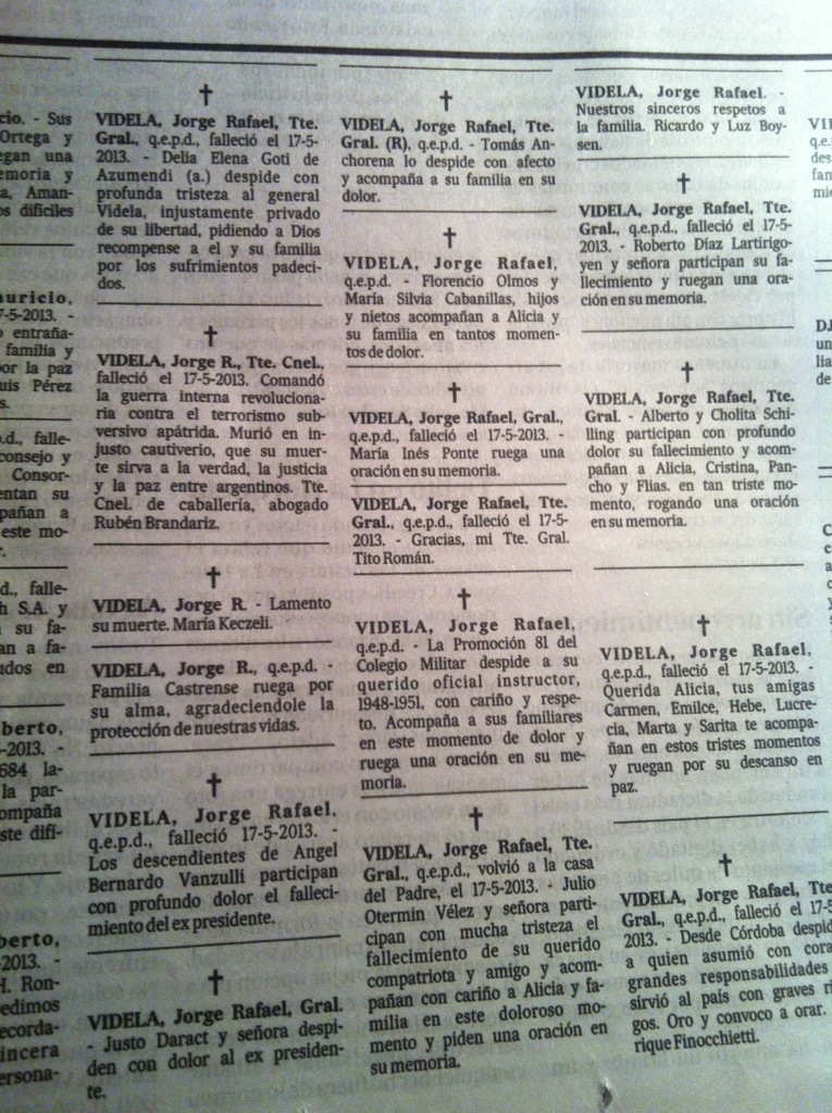 En el diario «La Nación» se concentraron cantidad de avisos fúnebres por Videla. No tuvieron siquiera problemas en publicar frases tales como «Comandó la guerra revolucionaria interna contra el terrorismo subversivo apátrida» y agrega: «Murió en injusto cautiverio. Que su muerte sirbva a la verdad». Quien firma esto dice ser abogado, de nombre Rubén Brandariz.