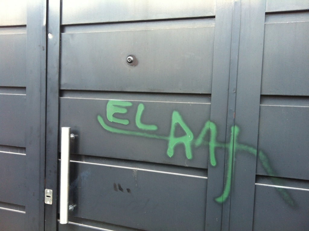 Este es el portón forzado del frente de la casa robada, con puntazo y grafitti tumbero de casa marcada.