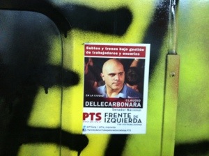 El Subte B de paro por 24 horas. El Metrodelegado Claudio Dellecarbonara y detrás el cartelito «Dellecarbonara Senador PTS»