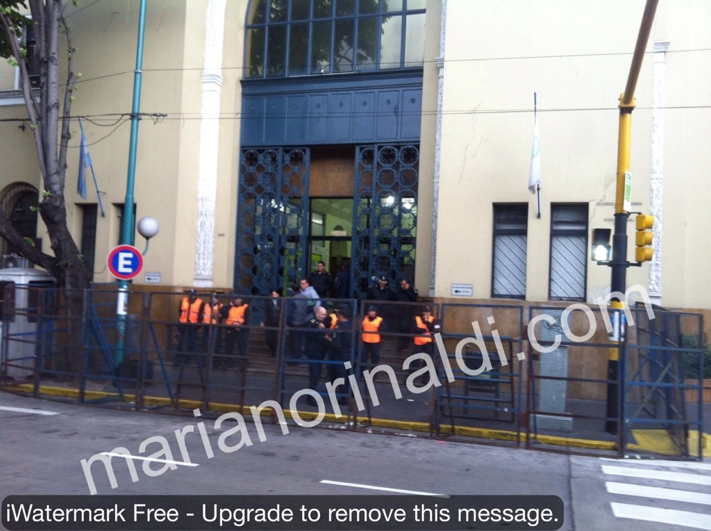 Municipalidad vallada y con efectivos policiales. Un micro de la infantería por Maipú (en el frente) y dos más por Ricardo Gutierrez (la calle lateral)