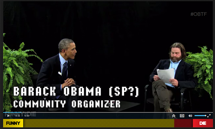En esta ocasión y con el propósito de publicitar el «Obama care» entre los jóvenes, es el presidente norteamericano quien enfrenta al insufrible gordito de «La resaca» (O «Qué mpasó ayer» en argentina). Los resultados a la vista…
