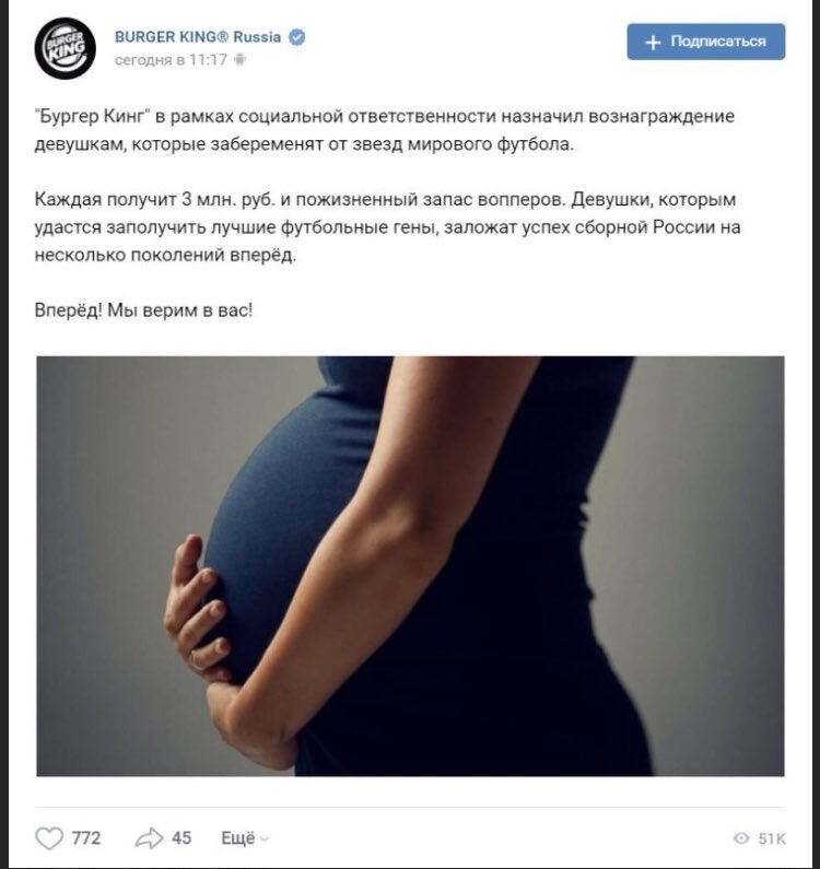 Burger king debió retractarse y pedir disculpas por una campaña totalmente fuera de lugar y de época: la versión rusa de la multinacional ofrecía 40 mil euros y hamburguesas de por vida a las mujeres que acudiesen a una cita y quedaran embarazadas de estrellas de fútbol del mundial: el objetivo era «Garantizar el éxito de la selección rusa en las próximas generaciones».
