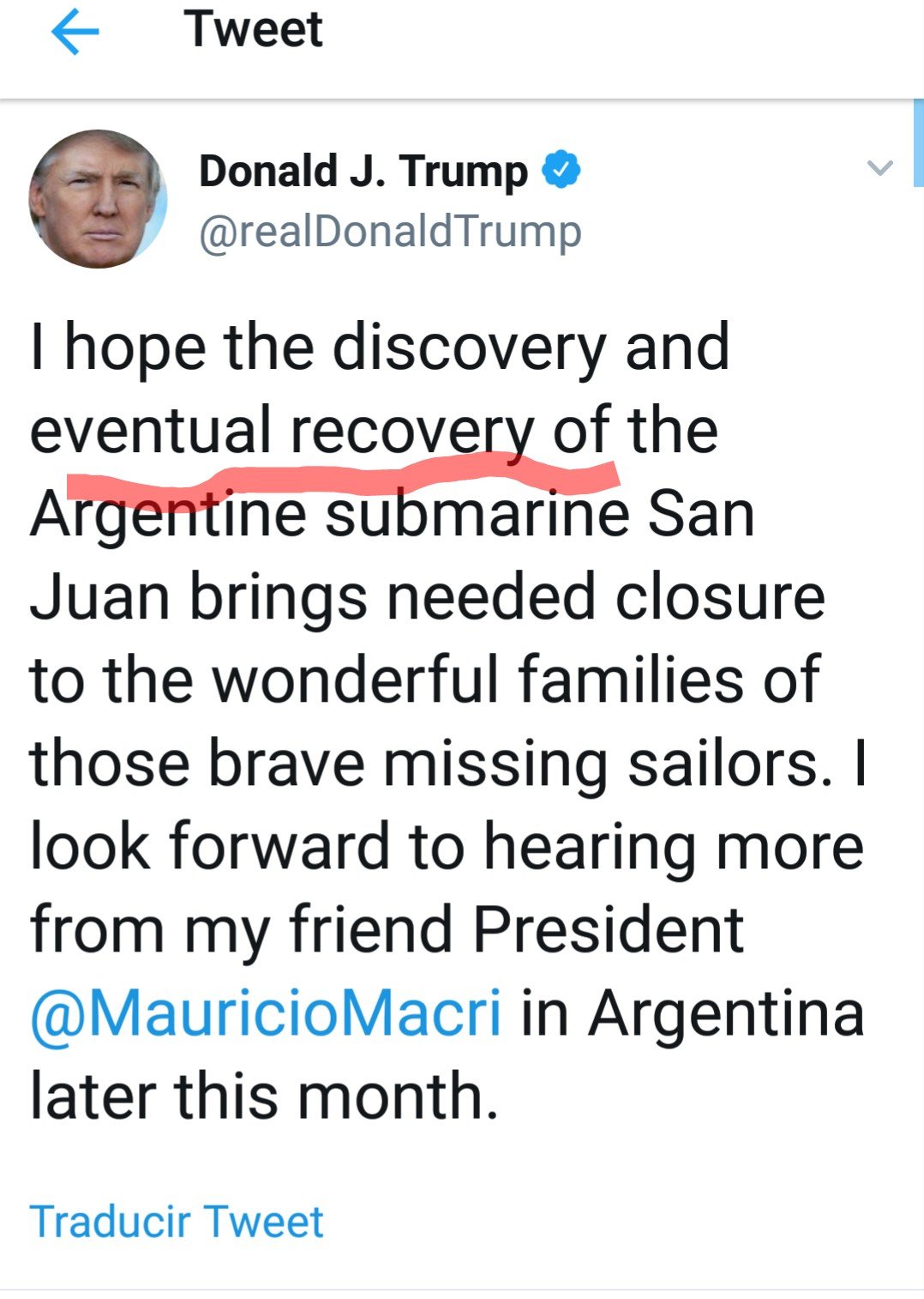 «Espero que el descubrimiento y la eventual recuperación del submarino argentino ARA San Juan traíga un necesario cierre a las maravillosas familias de esos bravos marinos desaparecidos. Espero escuchar más acerca de esto en Argentina a fin de mes con mi amigo el presidente Macri»
