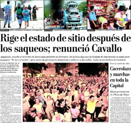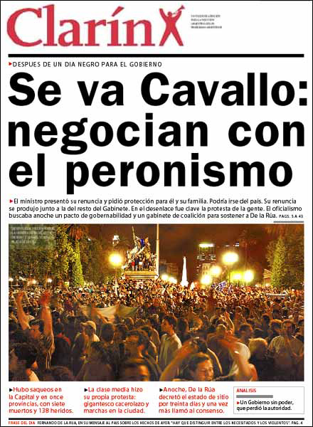Fue cerca de las siete de la tarde, cuando los saqueos arreciaban en plena Capital Federal y las calles de Constitución eran un virtual campo de batalla, cuando el gobierno decidió intentar con el estado de sitio, que debería haber sido implementado -en todo caso- por el congreso.