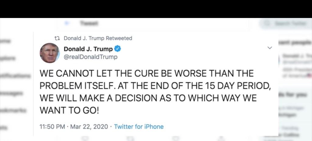 Al presidente preocupa el impacto económico de estas restricciones que considera excesivas: “Podemos hacer dos cosas a la vez” dice Trump, quien piensa que se puede combatir al coronavirus y mantener la economía activa a la vez.