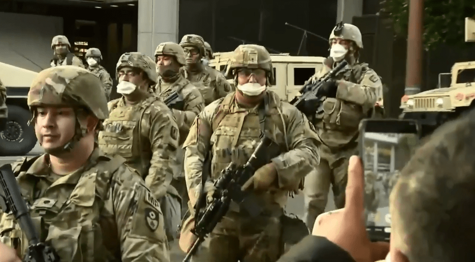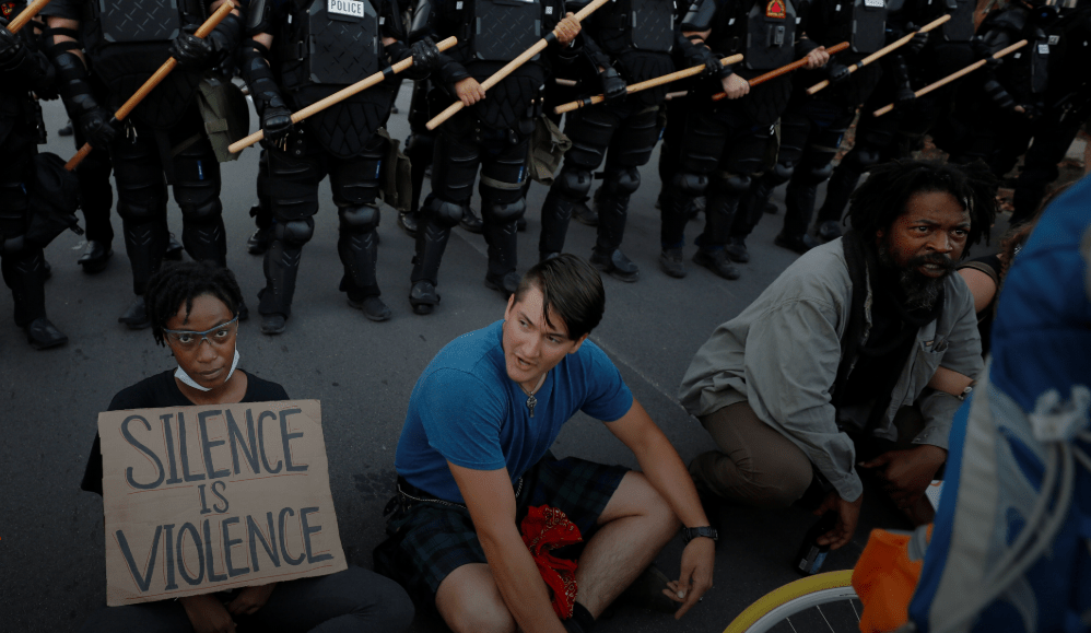 Más temprano había habido protestas pacíficas en todo el país, incluyen una multitud de rodillas en Times square, New York. Tampoco era violenta la multitud reunida a las puertas de la sede de Gobierno estadounidense.