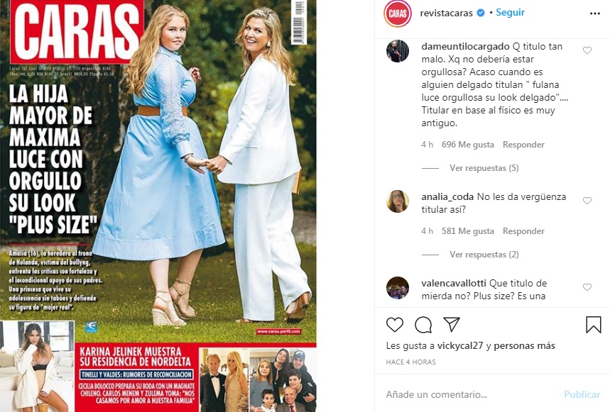 Una vez más una tapa de Caras genera rechazo en el público: Esta vez se metieron con el cuerpo de una adolescente. Titularon «La hija mayor de Máxima luce con orgullo su look Plus size» los seguidores de la revista no se hicieron esperar y llenaron el instagram de la publicación de mensajes repudiando la «iniciativa».