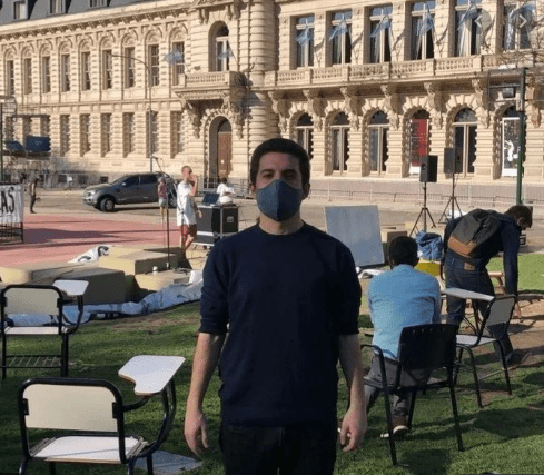 El docente chozno de Domingo Faustino brindó una clase al aire libre en la plaza que se encuentra frente al Ministerio de Educación de la Nación para demostrar que sí se puede dar clases al aire libre y con el debido distanciamiento físico. Fue una clase pública de Educación Cívica en donde se repasó cómo afectó la cuarentena a las familias, la construcción de ciudadanía y la educación más allá de lo virtual.