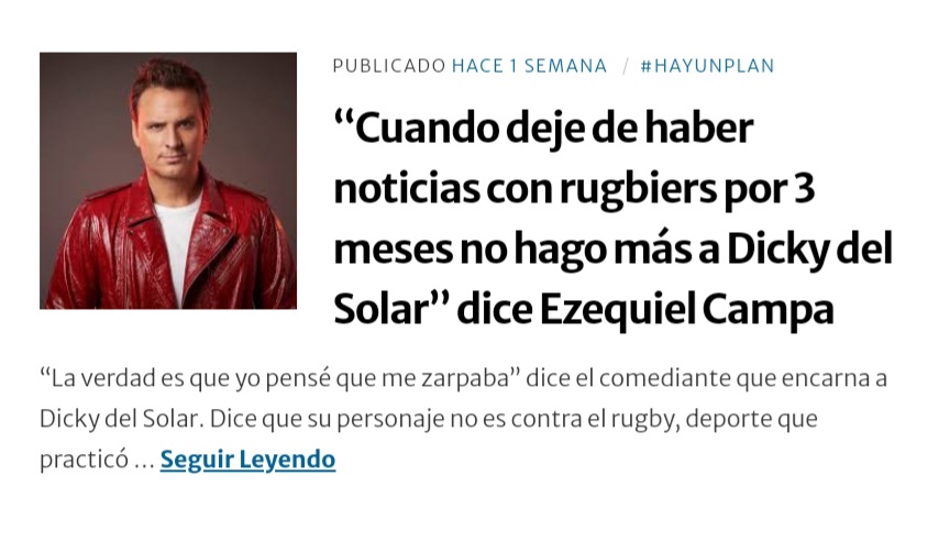 Cuando la semana pasada estalló el escándalo de los tweets de los pumas hablamos con Ezequiel Campa, el comediante que encarna a «Dicky del Solar» el rugbier que lo anticipó todo. En esa entrevista, Campa contó que cuando le dicen que no puede tratar así al rugby, él responde que «Cuando deje de haber noticias de este tipo vinculadas a rugbiers por tres meses, dejo de hacer a Dicky». Lo impresionante es que viene haciéndolo desde 2017. Esta semana un nuevo «episodio con rugbiers violentos» le alargó la vida al «Facundo Manes del rugby» por otros tres meses más…