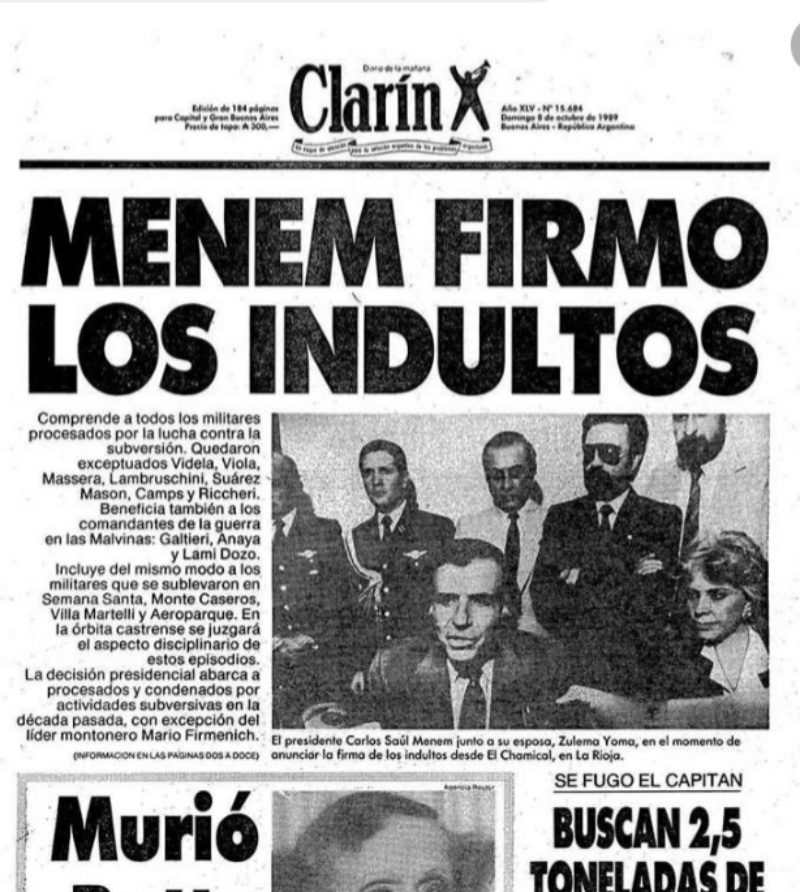 3- Llegan los indultos: Menem cancela la justicia sobre el accionar de los 70s con el pretexto de reunificar a la Argentina. «El tiempo dirá» decían los periodistas que se arriesgaban a cierta crítica por entonces.