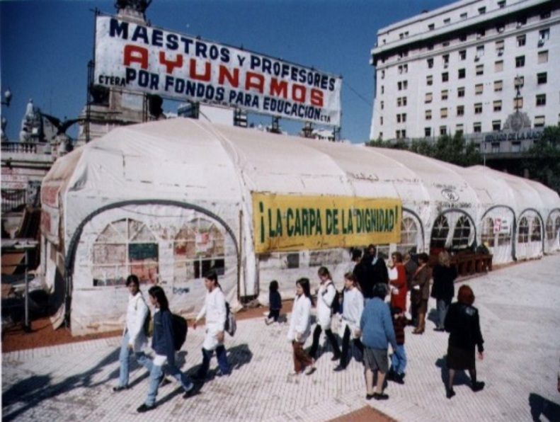 8- La carpa blanca: otros perdedores fueron los docentes. Aunque la inflación seguía nominalmente frenada, todo había aumentado, menos los salarios y los maestros se enterarán de que lo suyo «era un sacerdocio»
