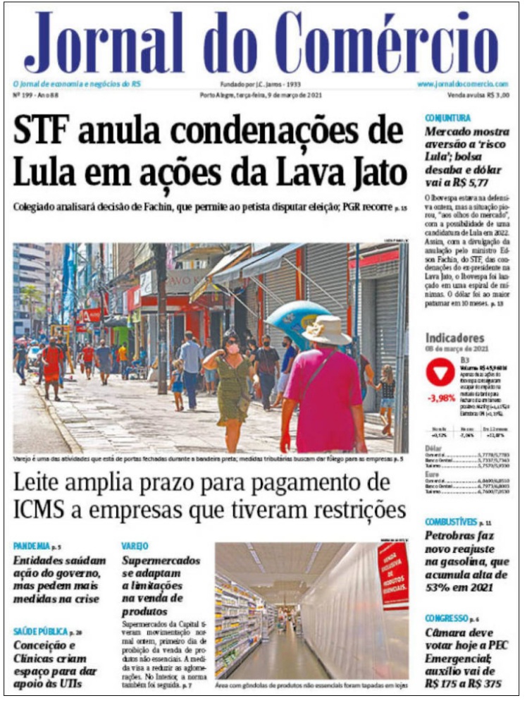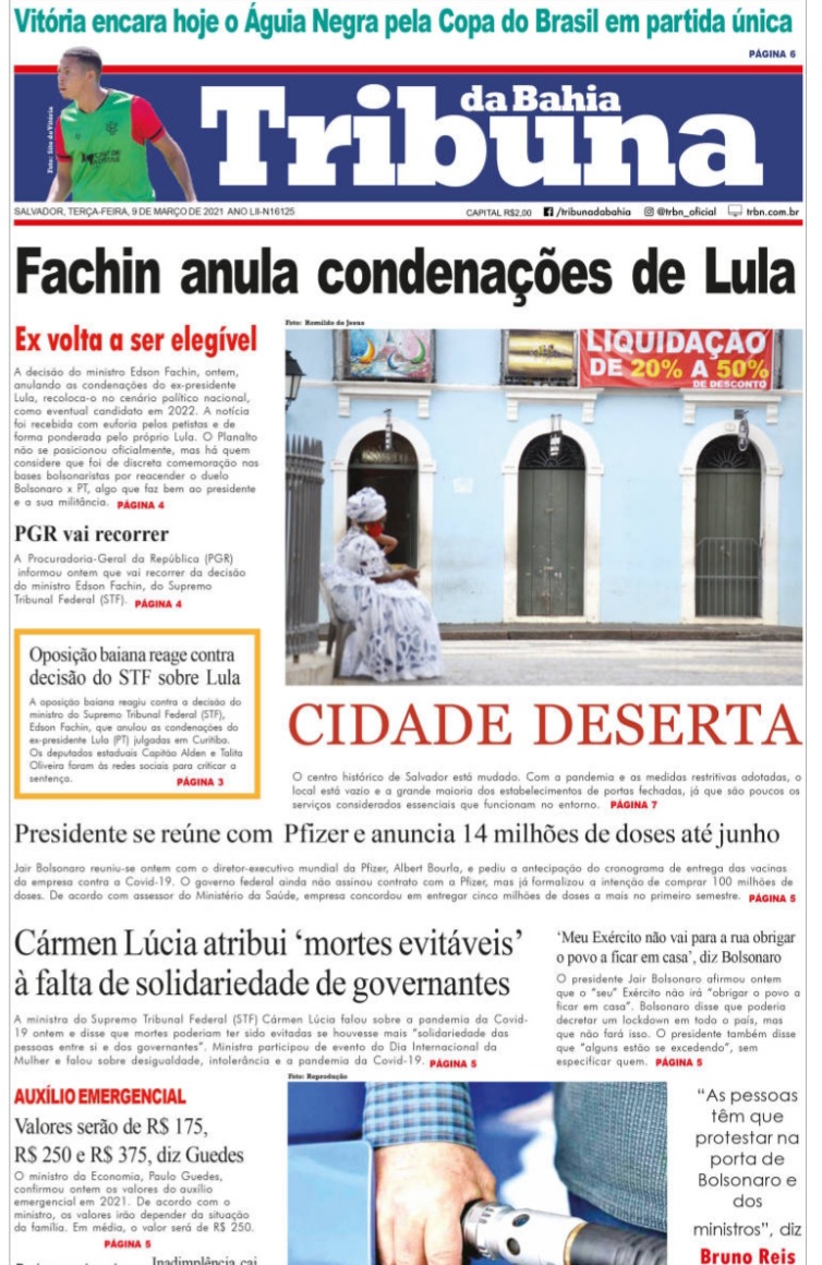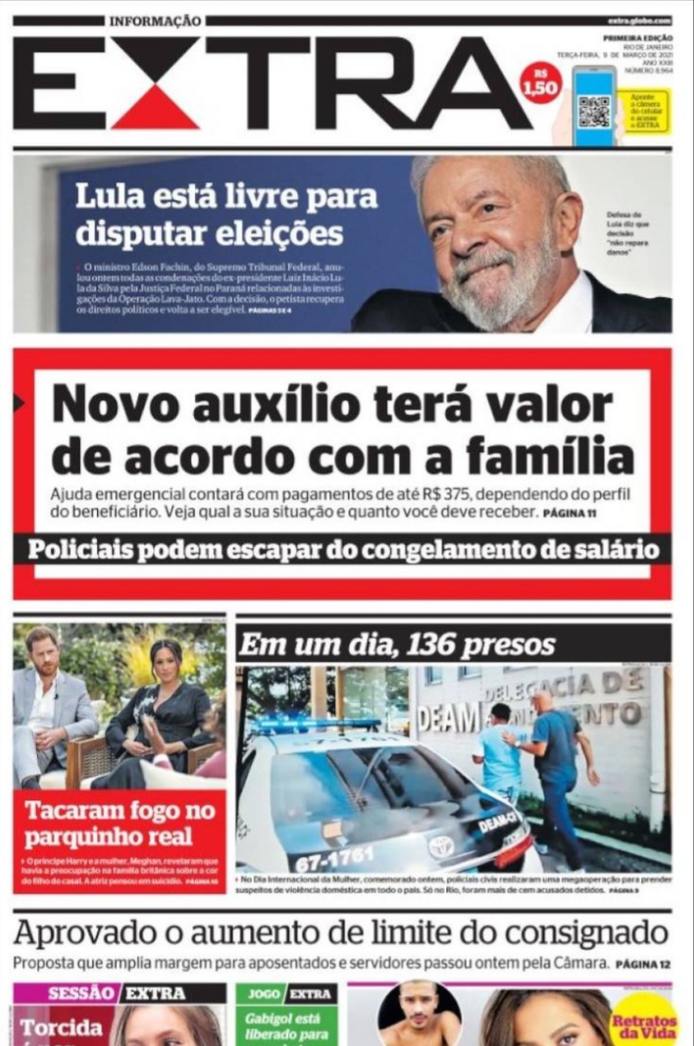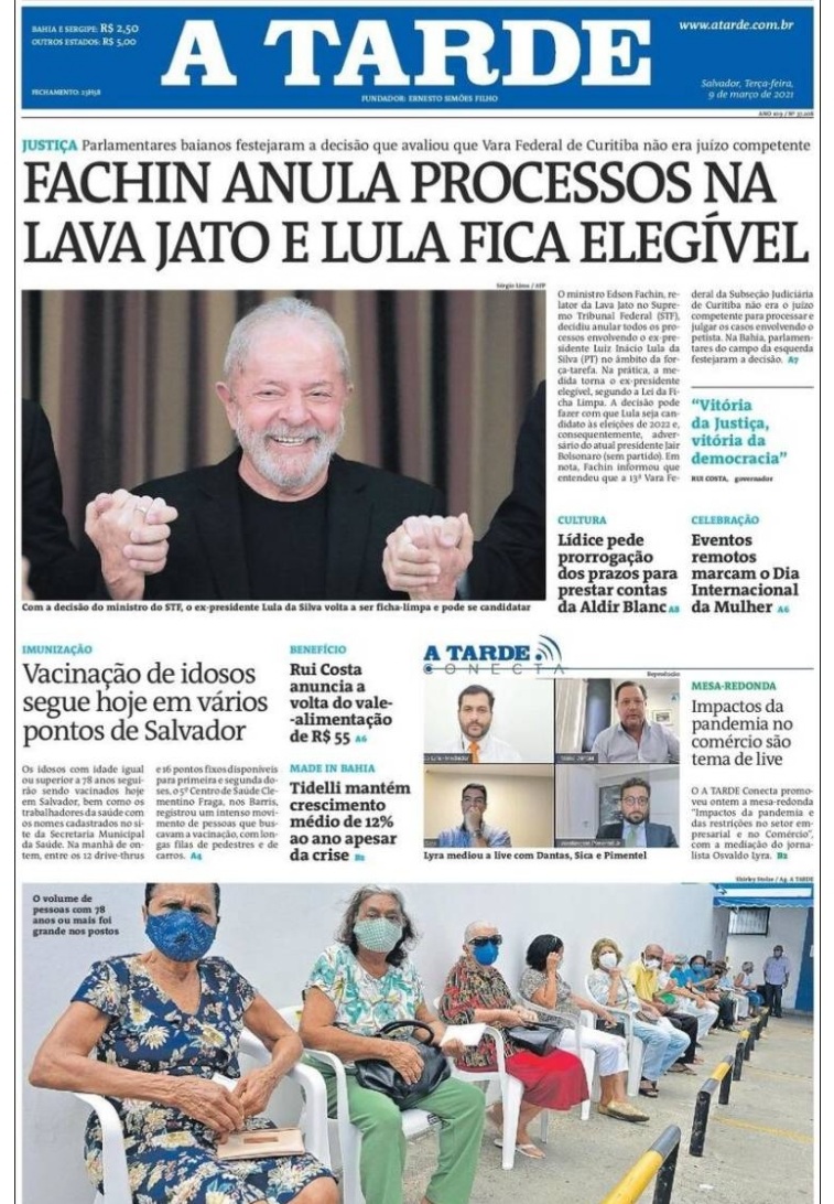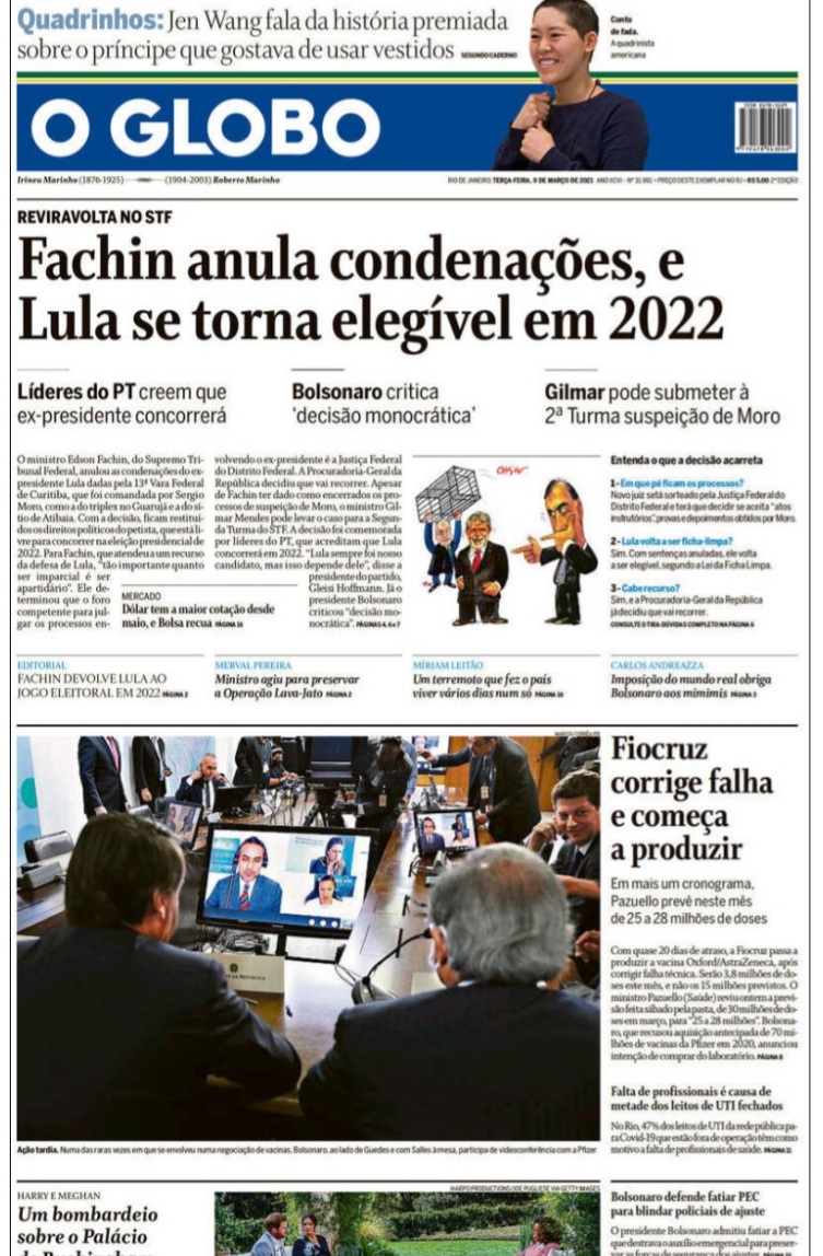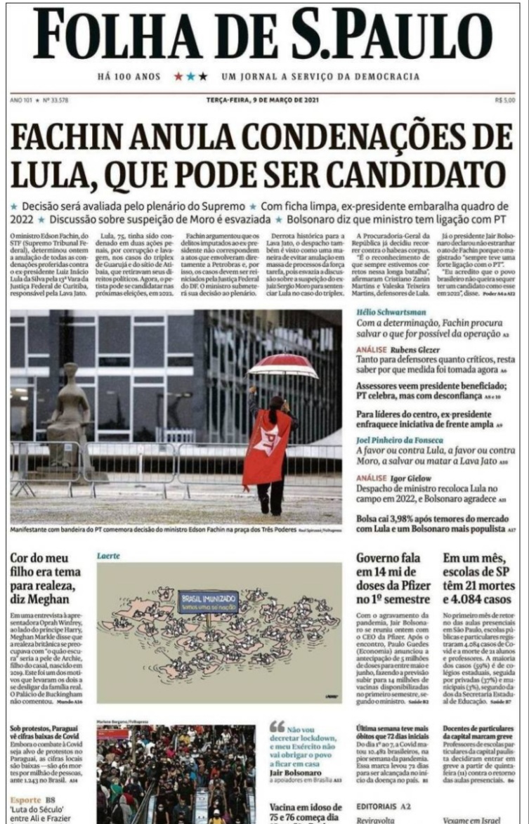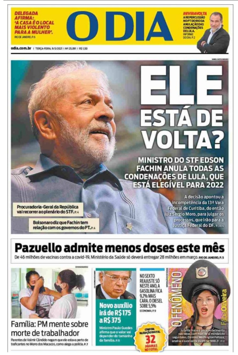 El juez de la Corte Suprema de Brasil Edson Fachin anuló ayer todas las sentencias dictadas contra Lula por la justicia federal de Paraná dentro de la operación anticorrupción Lava Jato, por considerar que el juez Moro desde Curitiba no tenía en «competencia jurídica» para analizar esos casos. De esta manera el ex presidente quedó nuevamente es situación de competir por la presidencia el año próximo. Así lo reflejan los diarios de hoy.