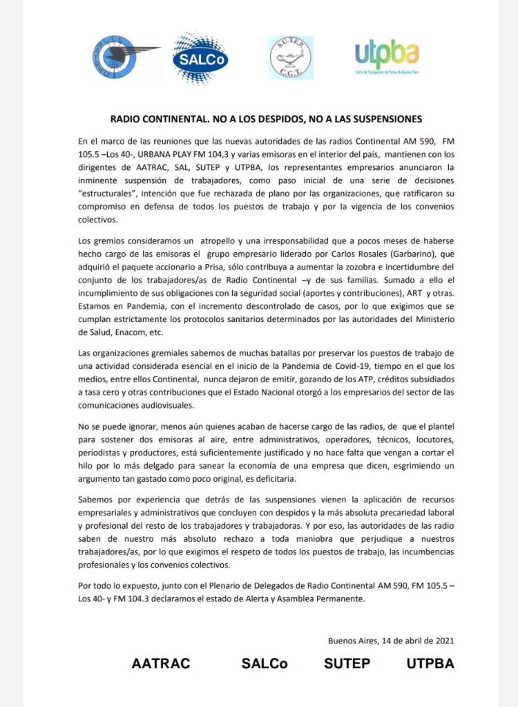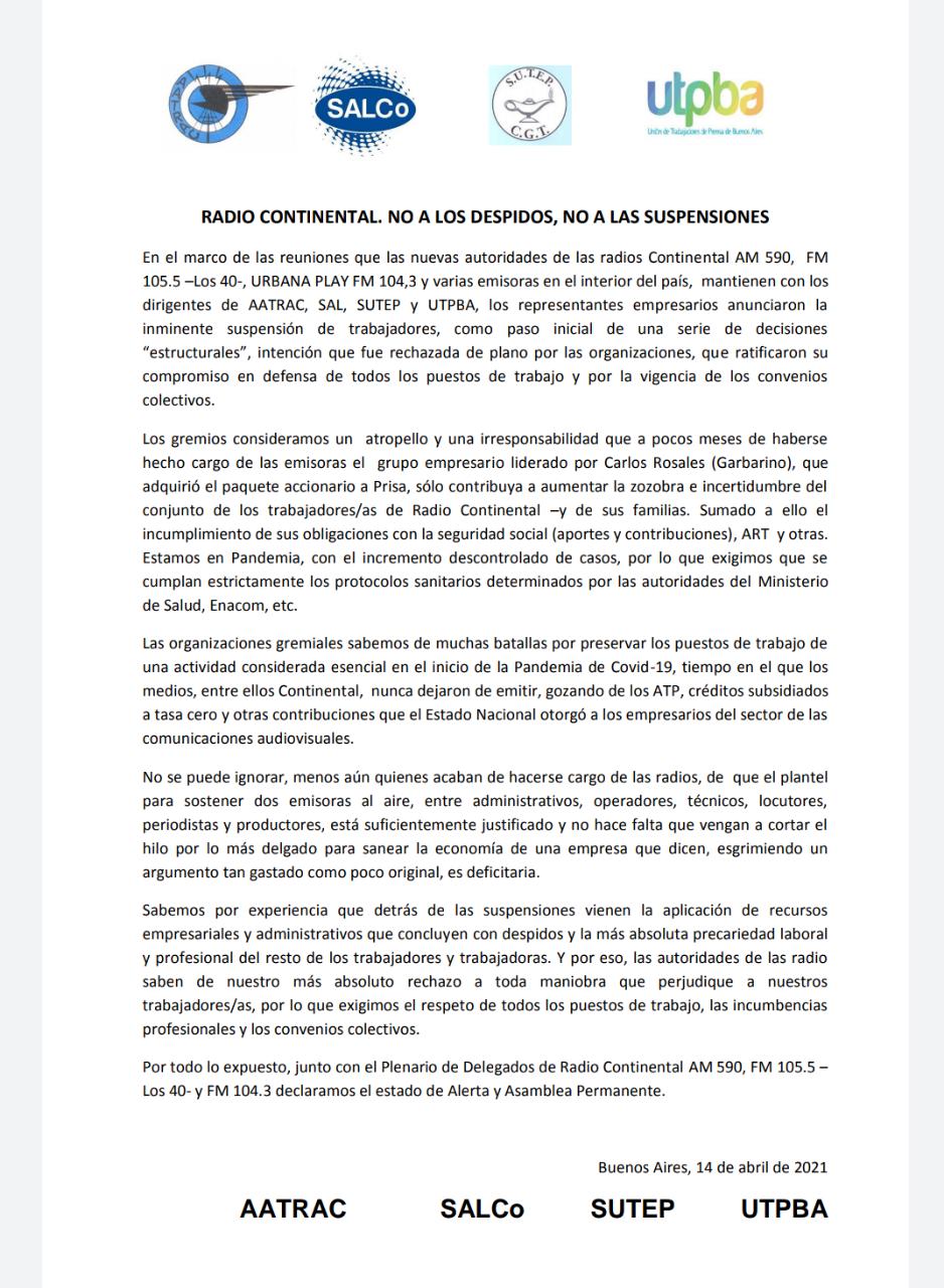 Es un muy mal momento para los queridos amigos y colegas que trabajan en Radio Continental: la empresa quiere reducir personal con licencias por 120 días con 75% del salario. Temen que se trate del inicio de medidas tendientes a cosas más graves.