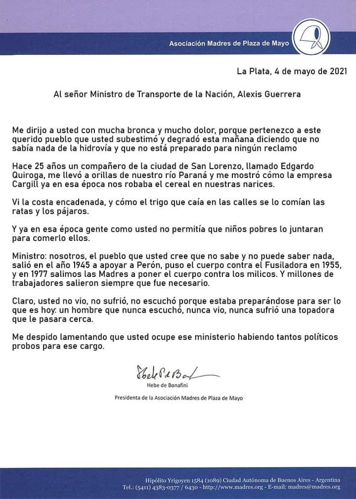 Otro capítulo de la interna oficialista? venerada por el kirchnerismo, Hebe no tuvo piedad del funcionario con horas de asumido por declaraciones que había formulado con respecto a la hidrovía