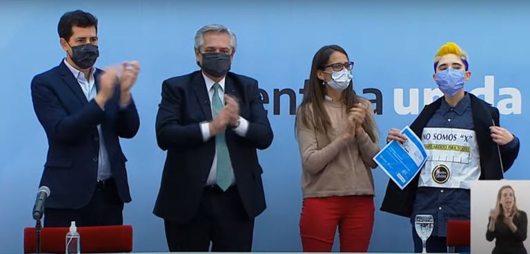 El presidente Alberto Fernández aseguró que «hay mil modos de amar, ser amado y ser felices» y celebró que «cada uno encuentre la felicidad a su modo». Fue durante la presentación en el Museo del Bicentenario del DNI para personas no binarias. Mientras hacía entrega de los nuevos documentos, una manifestante se paró a pocos metros del presidente y le hizo un reclamo cara a cara: “No somos una X” en alusión a la letra que reemplazará a la M y a la F ( de masculino y femenino ) en documentos de personas no binarias. En el acto, Alberto defendió con lenguaje inclusivo: “El ideal va a ser cuando todas y todos seamos todes”.