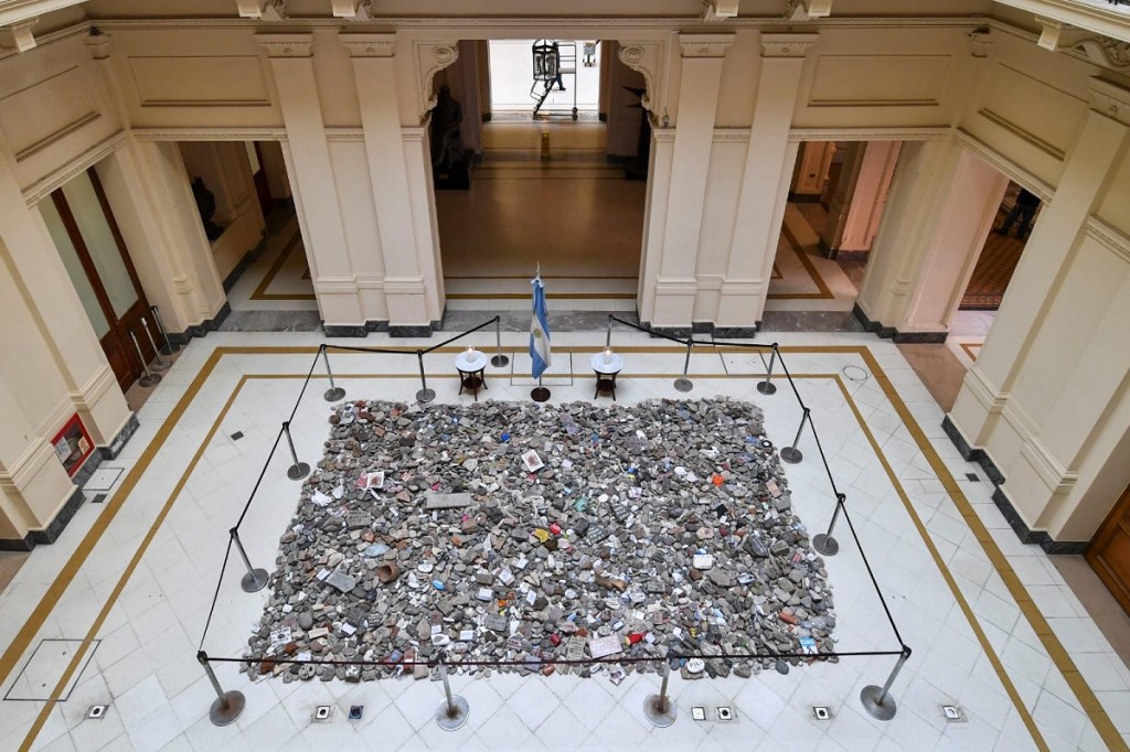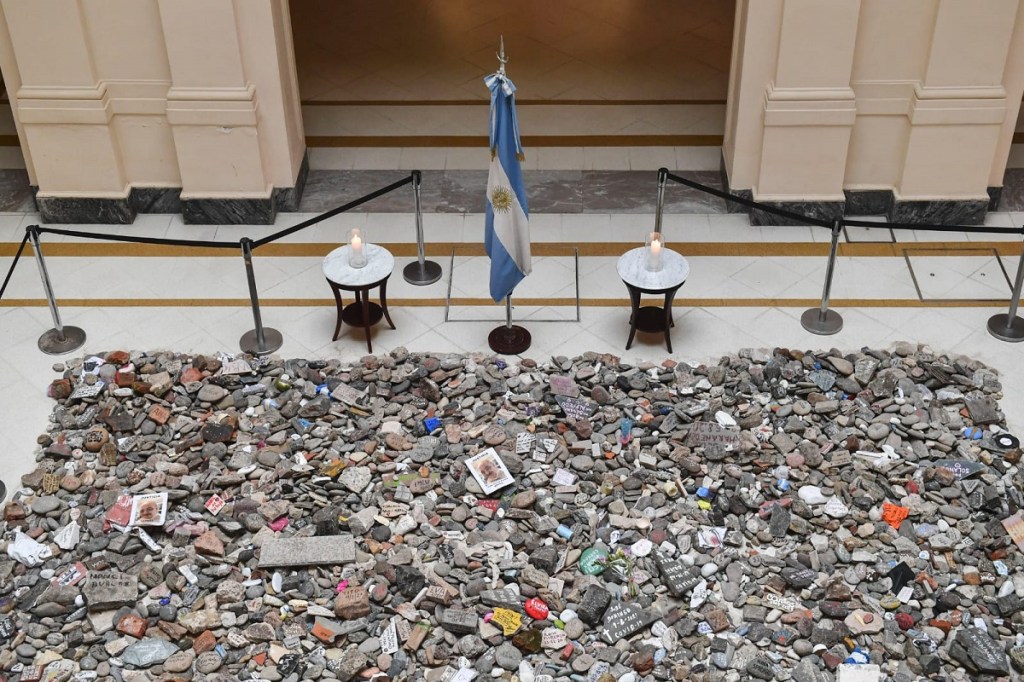 Tras la «Marcha de las Piedras» de ayer desde el Gobierno nacional se ordenó recoger las piedras que fueran depositadas con los nombres de las personas fallecidas para guardarlas adecuadamente y posteriormente encarar la construcción de un espacio en su memoria. Así se puede ver a dichas piedras en el interior de la Casa de Gobierno, mientras se dispone el lugar en el que se erigirá el «Espacio de la Memoria» en homenaje a los fallecidos por Covid.