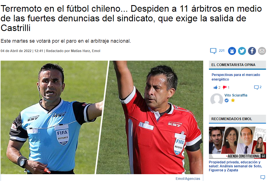 «Luego de que la semana pasada el Sindicato de Árbitros del fútbol chileno denunciara irregularidades en la Comisión de Árbitros y de exigir la salida inmediata de Javier Castrilli, este lunes hubo un verdadero terremoto» dice el popular site trasandino Emol.com