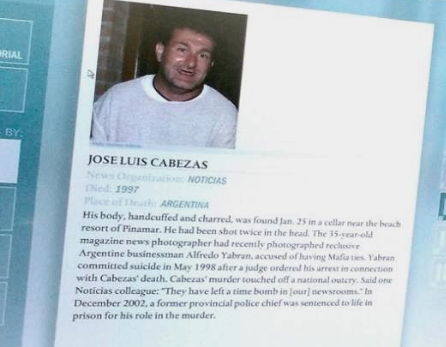 Los argentinos tenemos un representante en el panteón de los periodistas caídos en el cumplimiento de su trabajo, que se encuentra en el «Newseum» el «museo de las noticias» de Washington, Estados Unidos.