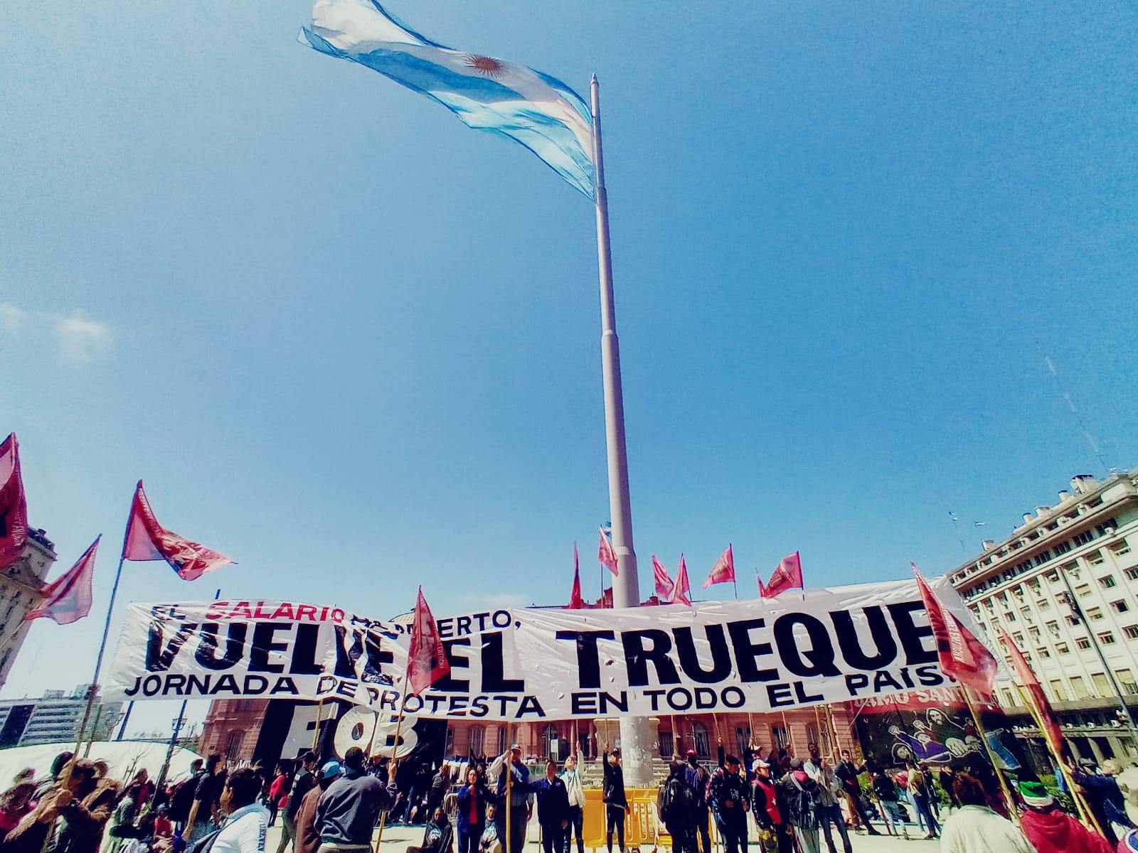 Fue en la plaza de mayo y como resultado de una convocatoria realizada por organizaciones y partidos de izquierda. Melisa, integrante del frente de organizaciones en lucha, explicó que los trabajadores informales no cuentan con los recursos para acceder a muchos insumos necesarios. Con las consignas «El salario ha muerto» y «Producimos pero somos cada vez más pobres» también se convocó al trueque otras plazas del país, como la Plaza San Martín de Mar del Plata y la Plaza Belgrano de Jujuy.