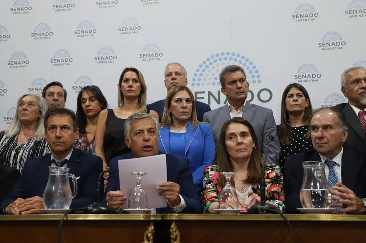 La oposición en el Senado brindó una conferencia de prensa y no bajó al recinto en desacuerdo con la votación promovida por el Frente de Todos, por lo que consideró un nuevo atropello de Cristina Fernández contra el orden institucional del país. «Vamos a seguir con la vía judicial. A nadie se le puede ocurrir que el tiempo pueda convertir un ardid en algo virtuoso», dijo el cordobés Luis Juez, quien según la Corte Suprema debía asumir como consejero en el Consejo de la Magistratura.