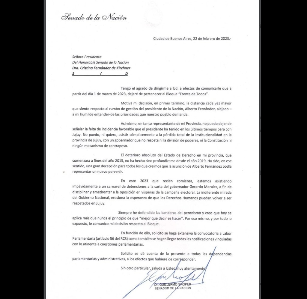 Mientras Alberto Fernandez se encuentra abocado a su viaje a la Antártida, el senador Guillermo Snopek envío su carta de renuncia al bloque del Frente de Todos, esgrimiendo como causal «Alejamiento de las necesidades del Pueblo argentino de por parte del Presidente».