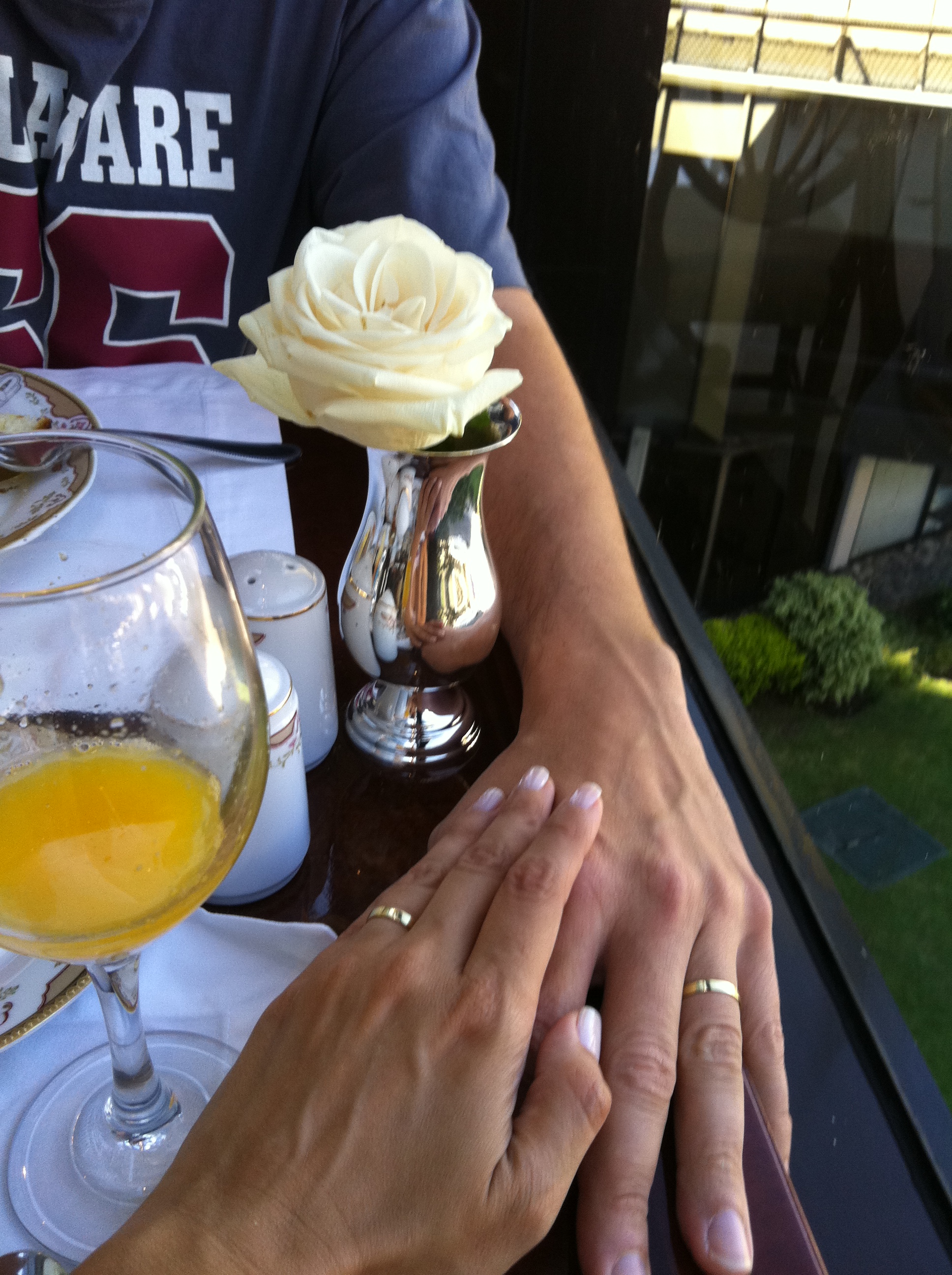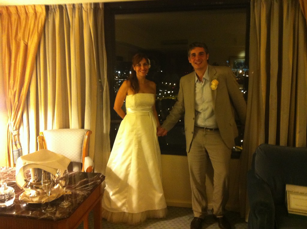 Una vez cumplida esta ceremonia tan íntima, nos fuimos al lugar en donde tendríamos nuestra primera noche como esposos: en un gesto inolvidable para nosotros, la gente de prensa del Sheraton nos había invitado a su «Park Tower». Al entrar en nuestra habitaciòn nos encontramos con rosas, champagne y otras sorpresas.