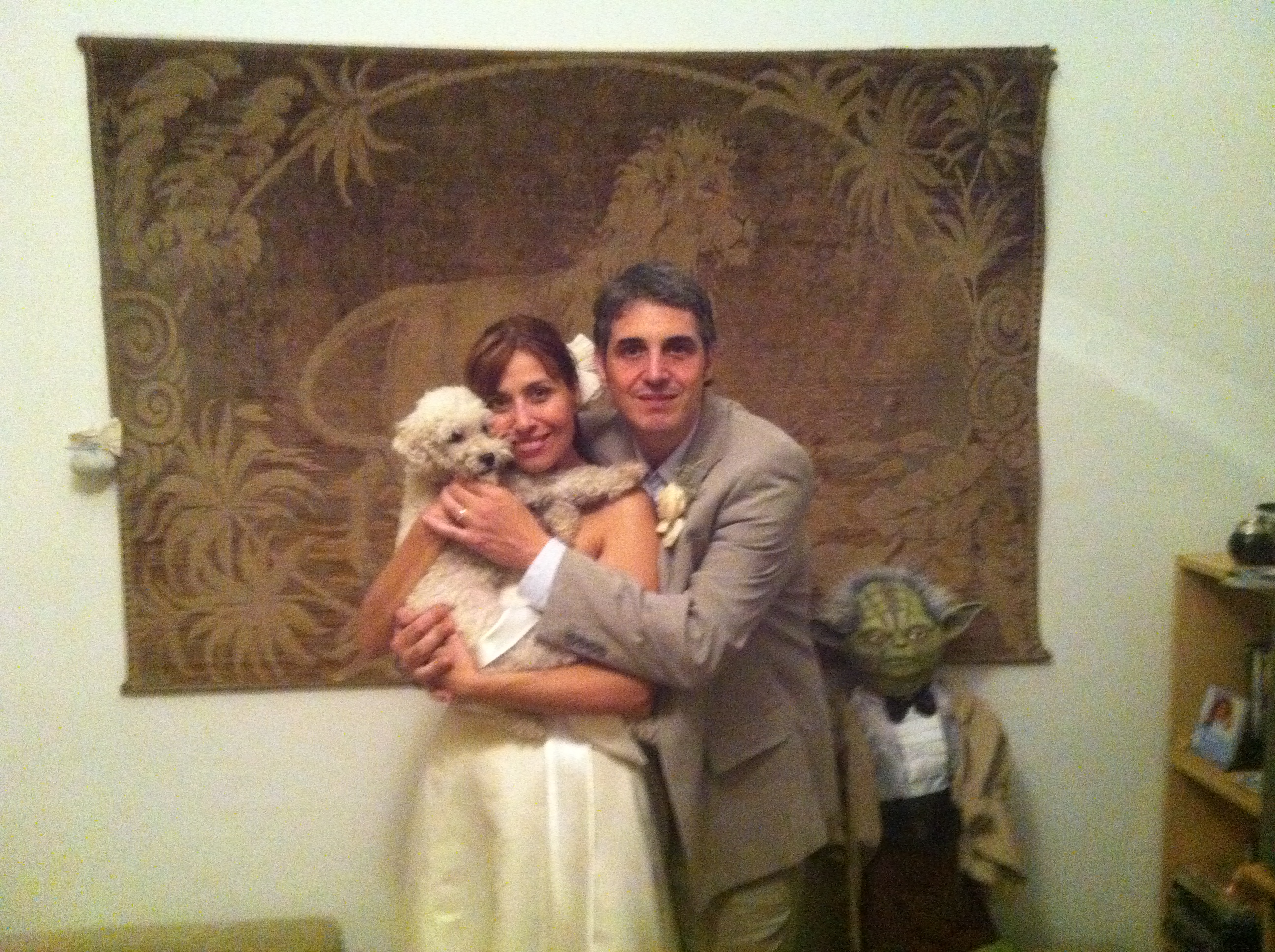 Cuando la noche empezaba a caer, nos fuimos. Y adónde iba a ir Andrea primero? A casa obvio! a ver cómo estaba Titi. En ese momento, antes de partir a nuestra noche de bodas, nos sacamos la foto familiar los tres juntos.