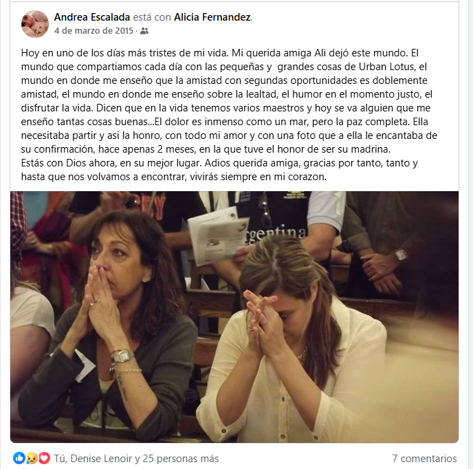Habiendo recobrado la amistad y la cercanía, esta nueva realidad nos sacudía: Alicia estaba peleando contra una dura enfermedad y en los últimos días su salud se había deteriorado bastante. Estaba cada vez peor. Recuerdo que fui a donar sangre para ella, mientras que Andrea la visitaba cotidianamente.