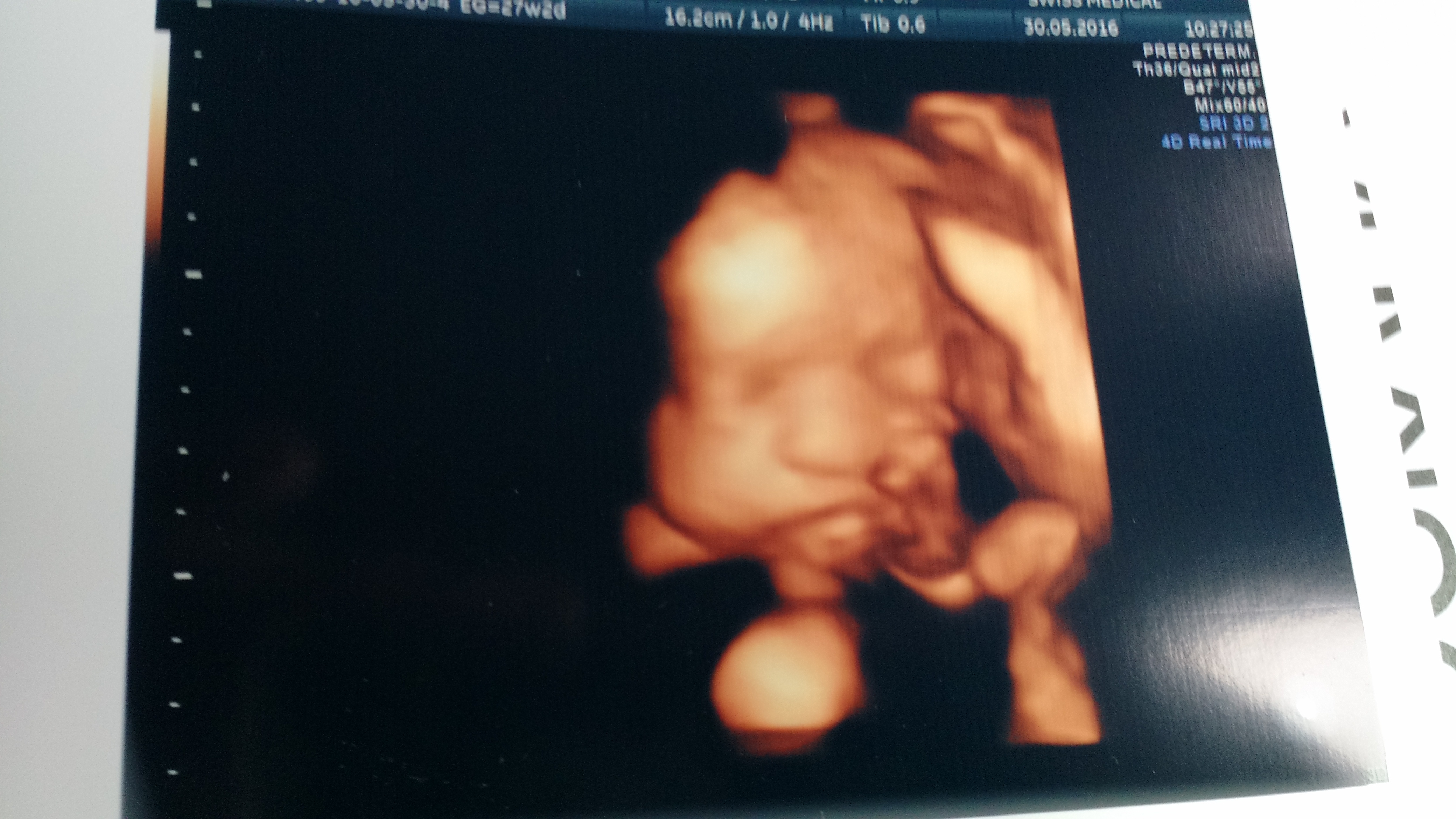 En la última resonancia de repente pude ver cómo la imagen se aclaraba y su rostro se me revelaba: pude verle un instante clarita la carita a mi hija antes de nacer! Cuando saqué la foto ya no se veía más… y depués se empezó a chupar el dedo!