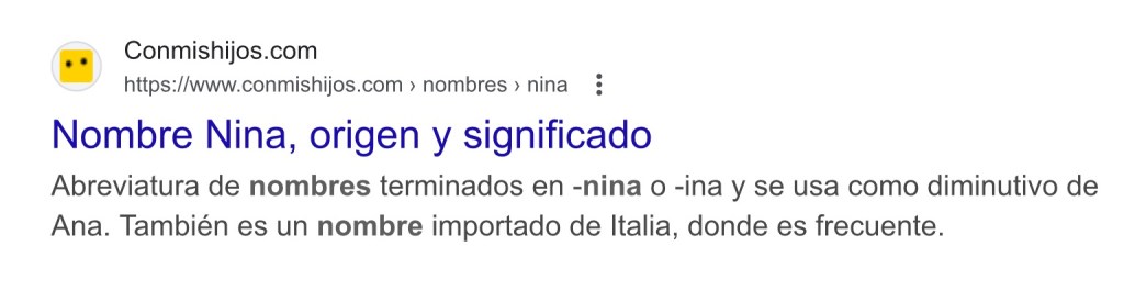 Cuando encontramos la respuesta no lo podíamos creer! Decía «Nina, nombre italiano. Origen del nombre Nina: Surge del diminutivo de Anna (Anina)». Al final mi vieja había no había resistido la negativa de su nombre y nos rebautizaba a la nena con su diminutivo!