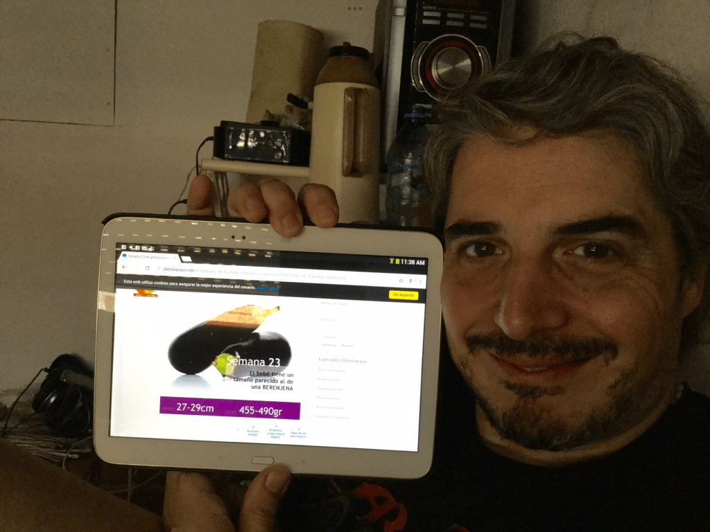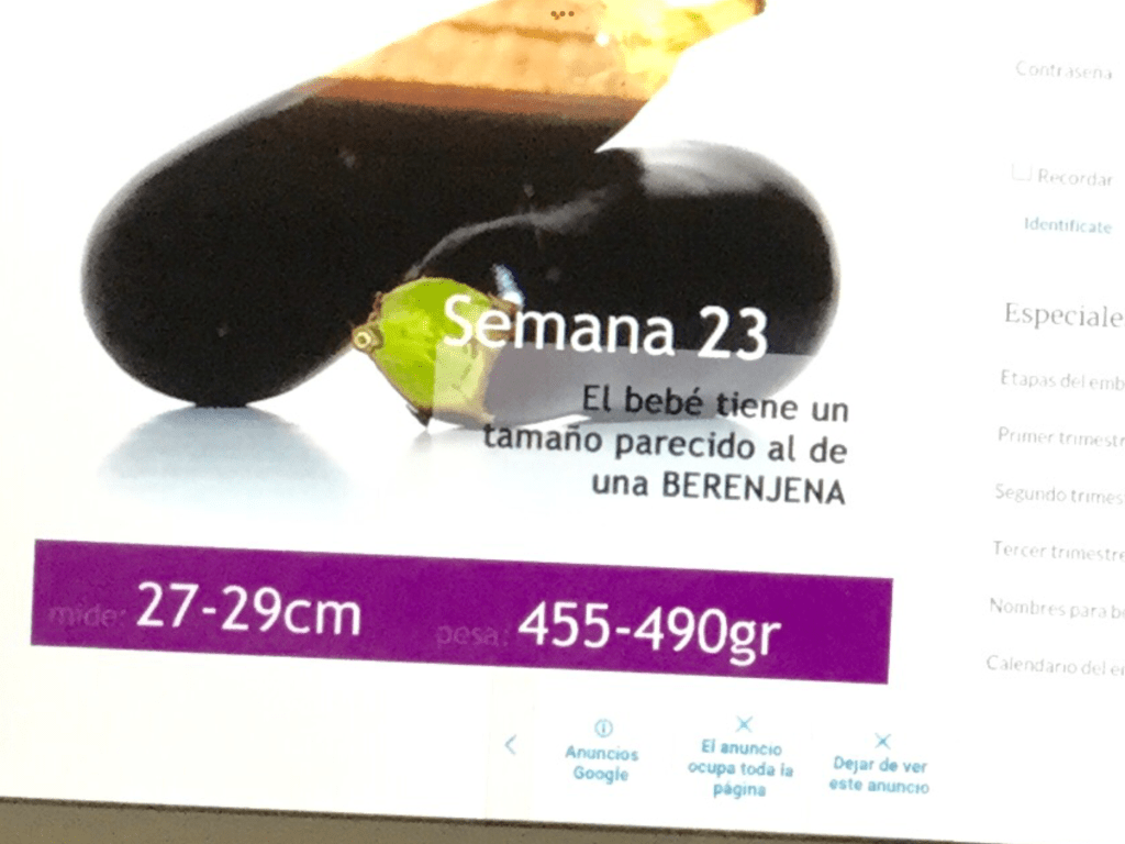 Eso de que el tamaño de nuestro hijo era entonces el de «un grano de arroz» nos dejó tan perplejos que empezamos a ver una página que comparaba semana a semana el crecimiento del feto con una fruta o verdura. Por ejemplo en esta foto que adjunto se lee: «Semana 23 – El bebé tiene el tamaño parecido al de una berenjena»