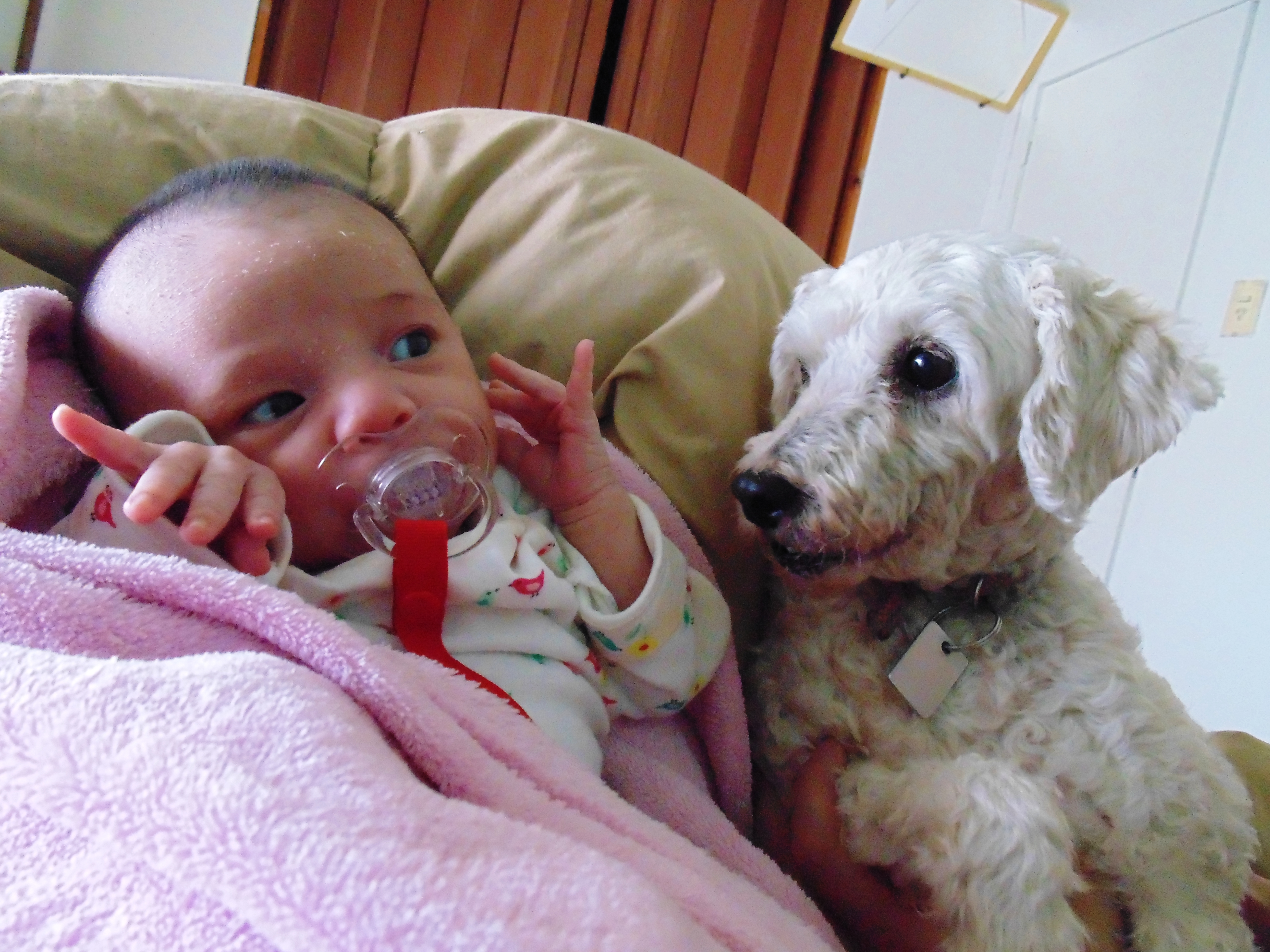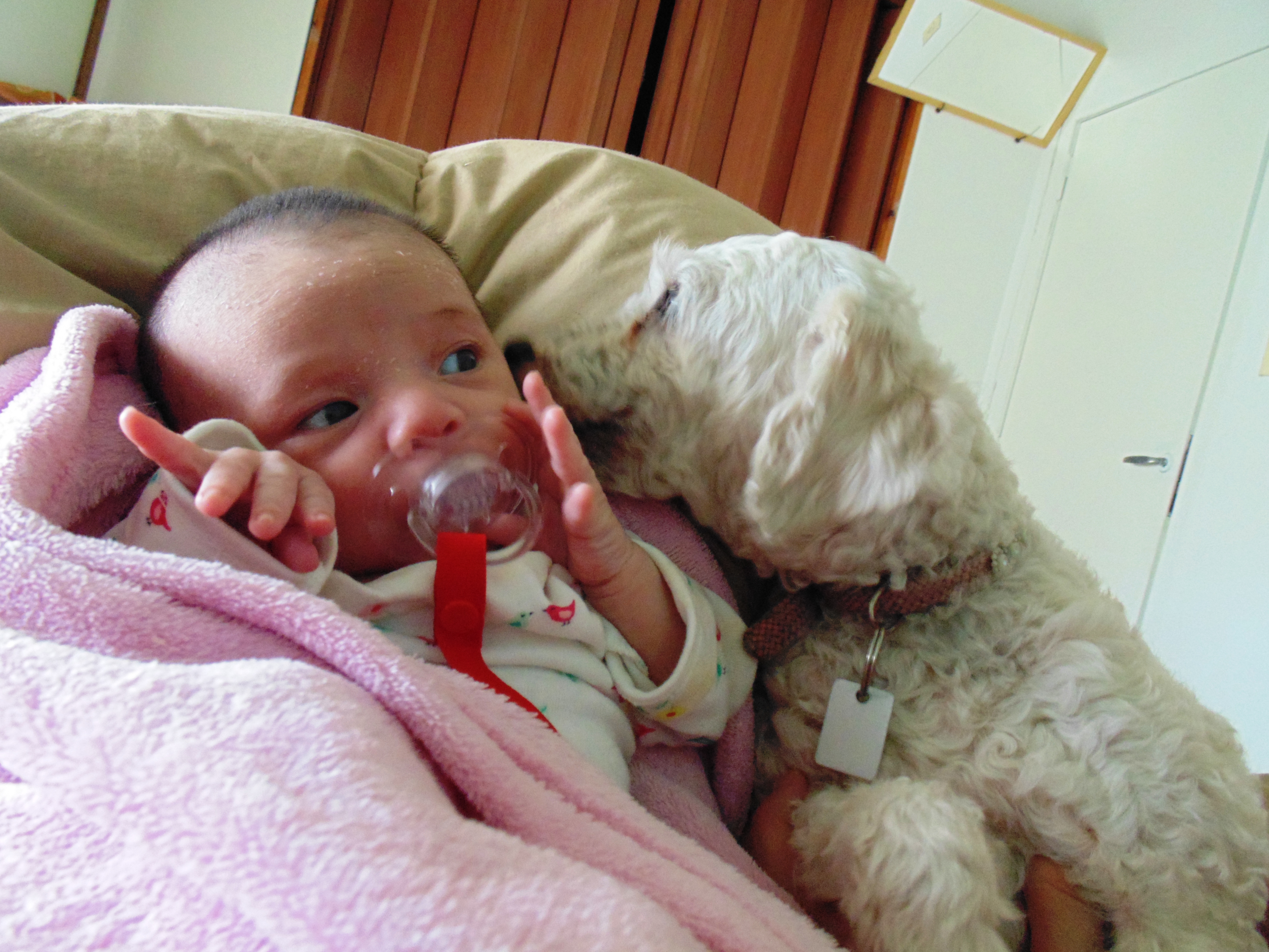 Pero eso no fue todo: La negrita Mora, la que me había mordido dejándome sangrando, la otrora salvaje y agresiva, pero ahora devenida en un dulce de leche, llegó al parto y compartió los primeros meses de Nina posando al lado de la frágil recién nacida con la ternura de un bambi.