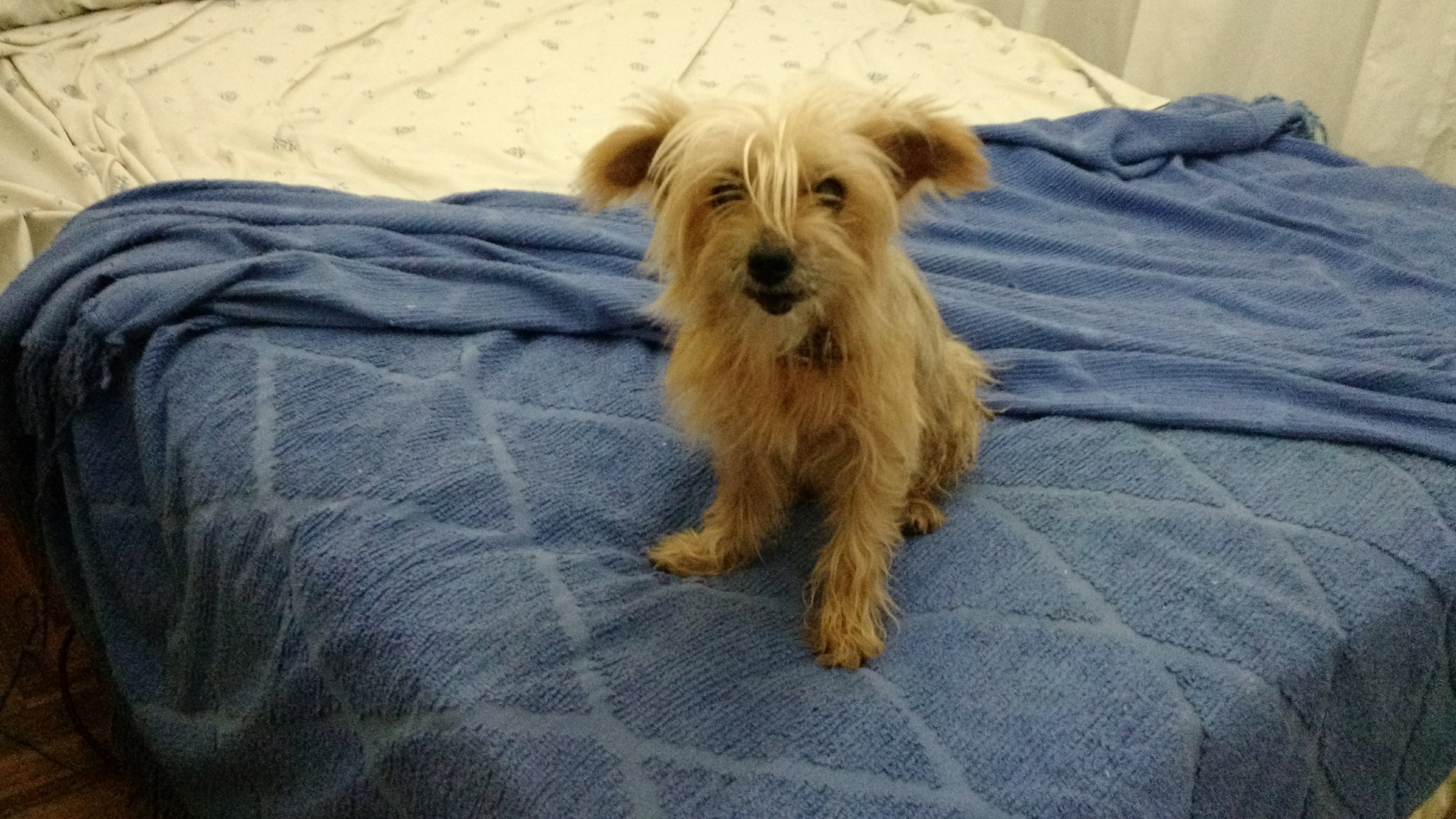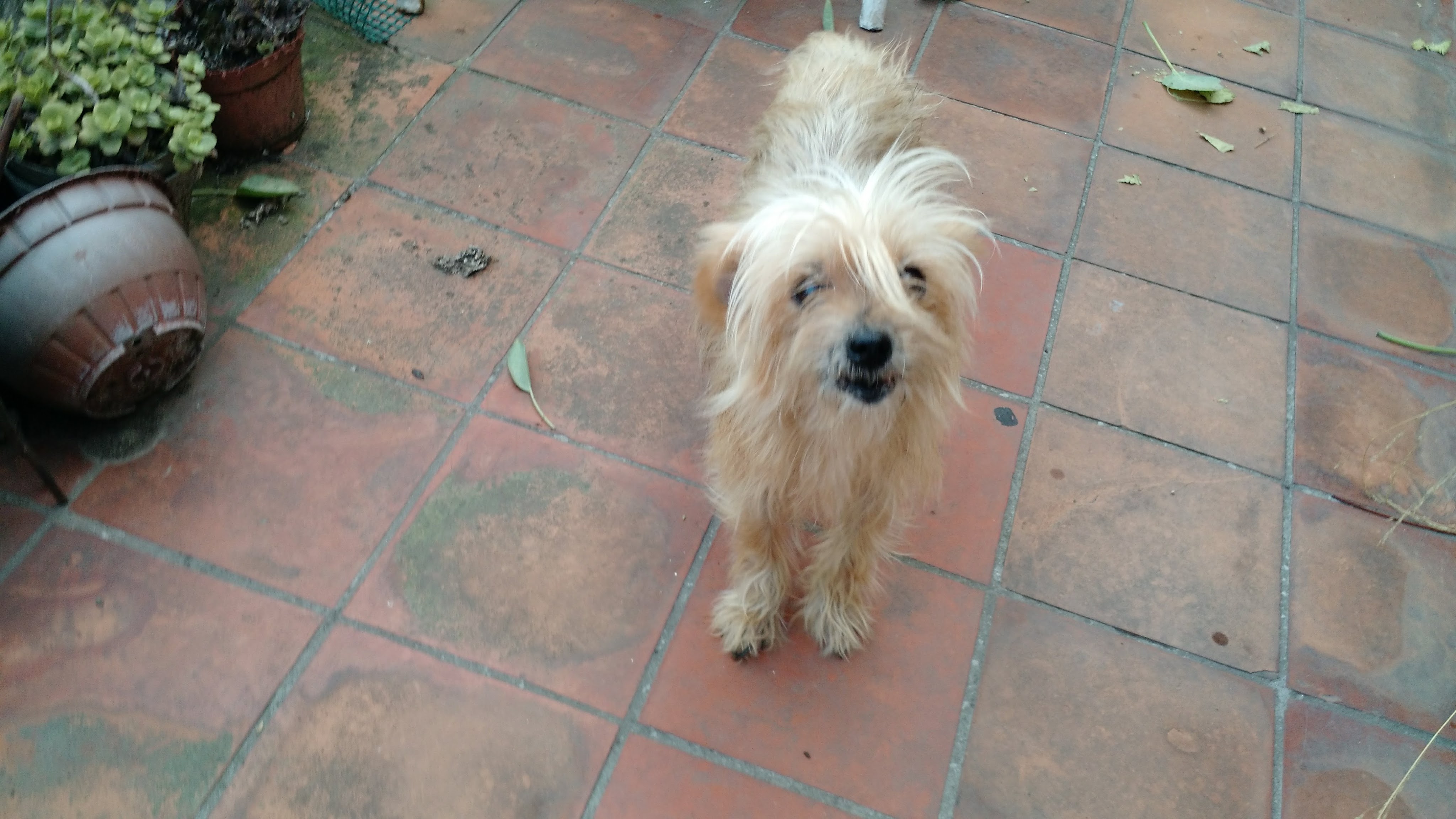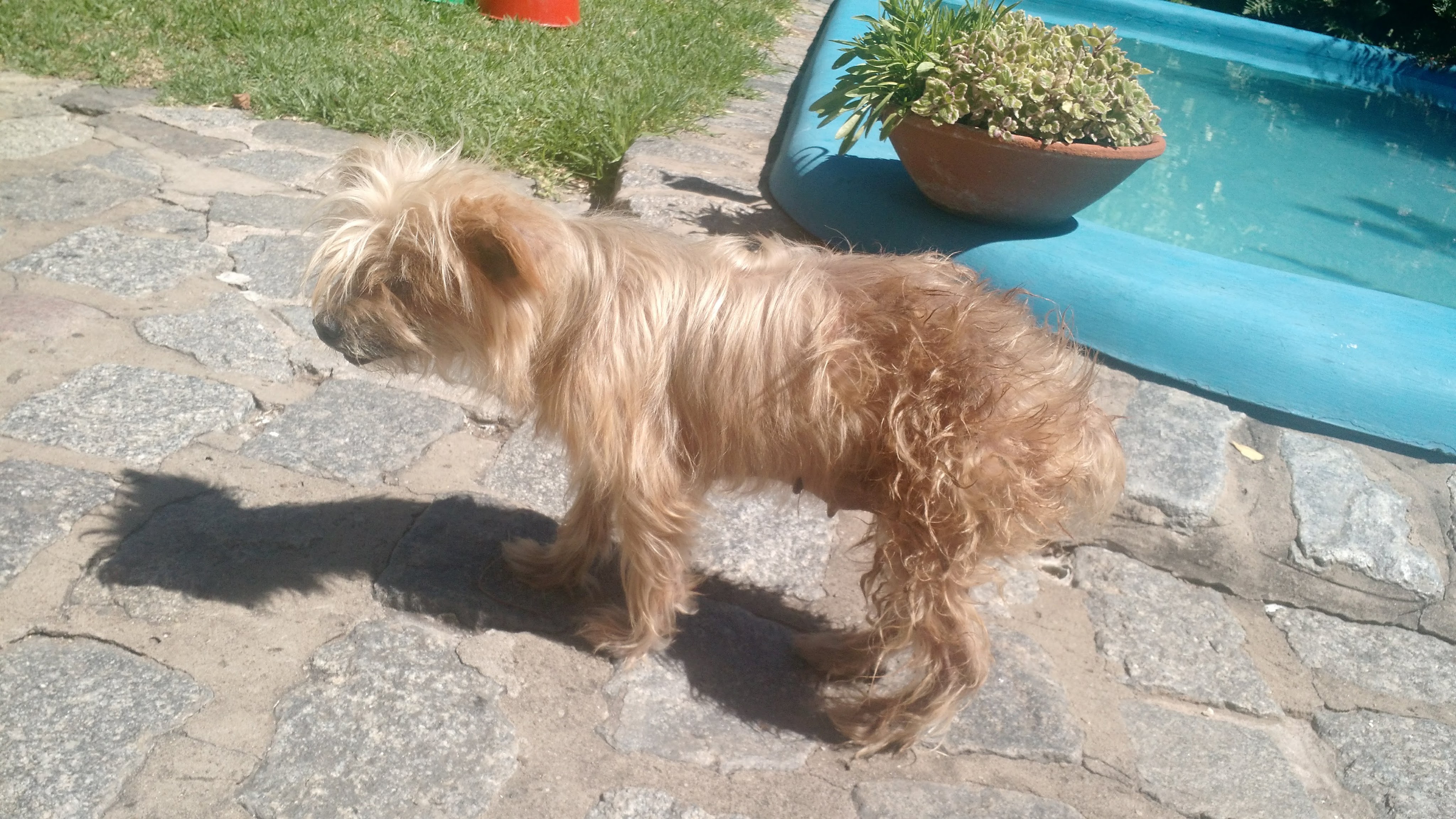 Lo fuimos a buscar y lo entramos. No era un «perrito» era una perra, que además tenía sus años y a pesar de ser de una raza cara (yorkshire) estaba bastante descuidada como si llevara varios días en la calle. No parecía haberse escapado ahora, pero estaba indudablemente mueta de miedo por la pirotecnia.