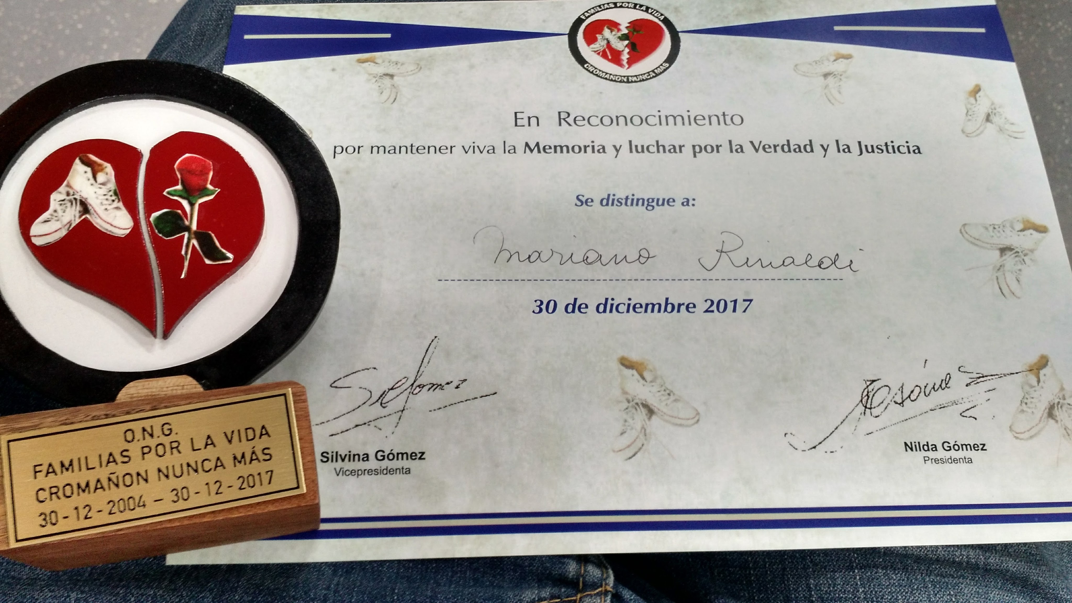 En medio de tan triste clima, al menos recibí un mimo: «Familias por la Vida» a través de Nilda Gómez me premió por mi trabajo acompañando periodísticamente a las familias sobrevivientes de Cromañon.