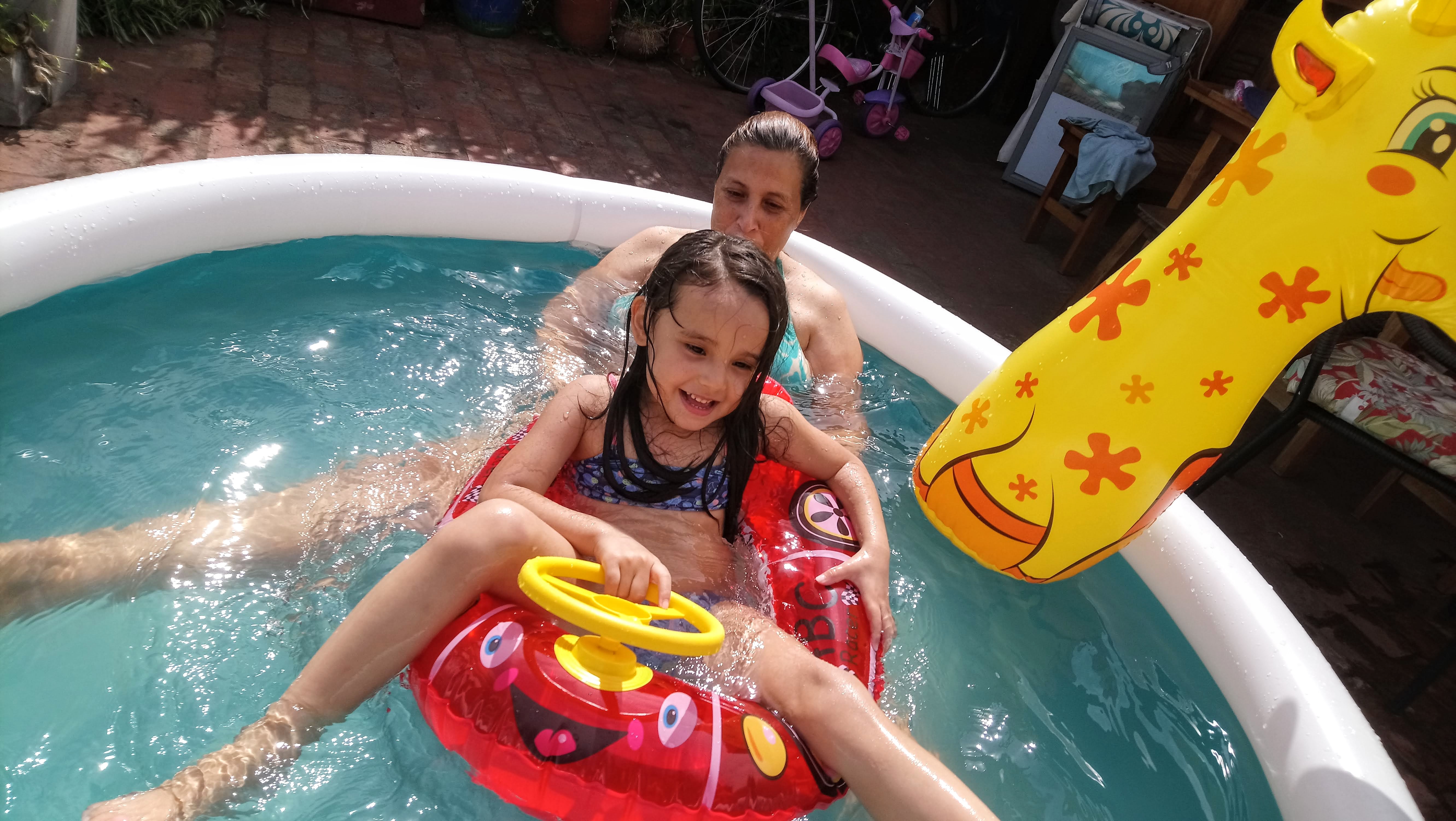 Vacaciones en algún destino turístico no habría ese verano: no habría ningún hermoso balcón en la costa, ni aviones ni granjas… pero teníamos nuestro «Vilo Rooftop»! Con sus asados que yo preparaba, con los “traguetes de colores” de Andrea y con Nina y su piletita inflable a la que le debíamos buena parte de nuestra alegría por aquellos días.