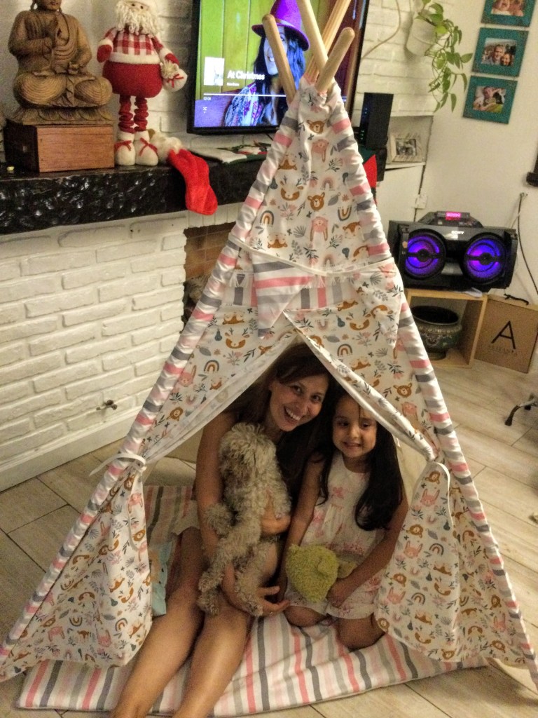 Esa noche, Nina esperó como siempre a Papá Noel, que justo aprovechó una idea de ella al baño para dejar sus regalos sin ser visto. Acá Andrea con Nina en uno de ellos: la carpa india!