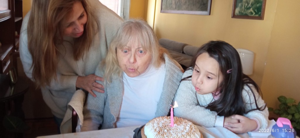 En ese mes de Junio, festejamos el cumpleaños de mi suegra todavía en su casa: limitada visual y motriz, precisaba cuidadoras constantes y eso a veces era complicado. Pero en 2022 estuvimos en el barrio de Once para cantarle el cumpleaños feliz y para que Nina le soplara las velitas de una torta que ella no veía… pero iba a saborear sin inconvenientes!