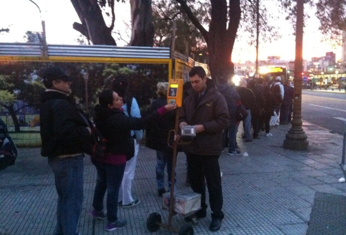 El inspector recorre la cola con un carrito para que la gente cargue la SUBE