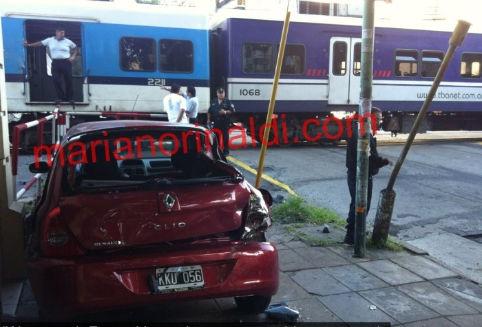 Sucedió en Boyacá y vias del Sarmiento El chofer se mandó de contramano para adelantarse a los que esperaban y cruzar la barrera baja. El auto quedó así