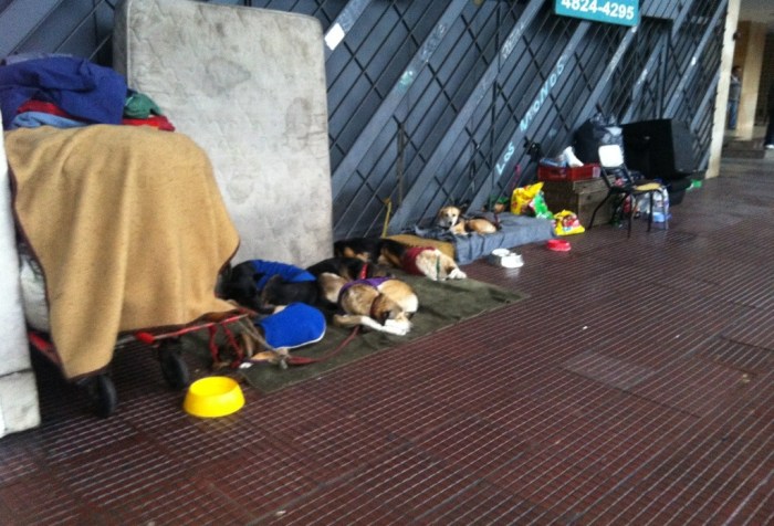 Él vive en la calle, pero a sus perros no les falta techo (la recoba de Paseo Colón) ni abrigo. Como podrán observar cada perrito tiene su tapado