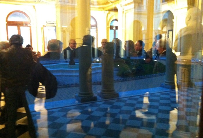 Calo, Belén, Fresia, Pignaneli, Viviani: van llegando, entran por explanada y se reúnen en el salón de los bustos. Esperan para ver a la presidente