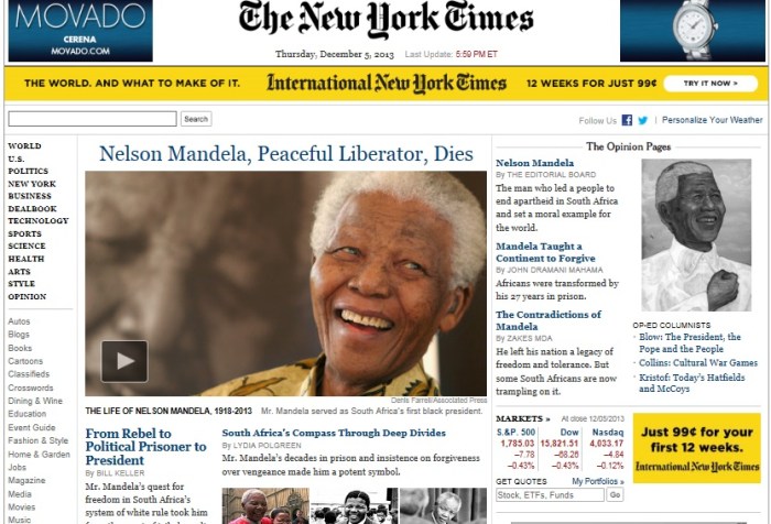 «»Muere Nelson Mandela: el libertador pacifista» «El guerrero anti-apartheid pierde su última batalla» (sí, son ingleses) «Muere Mandela, padre de la lucha anti-apartheid. El mundo llora a un hombre libre» … Seguir Leyendo Tapas del Mundo sobre la muerte de Mandela